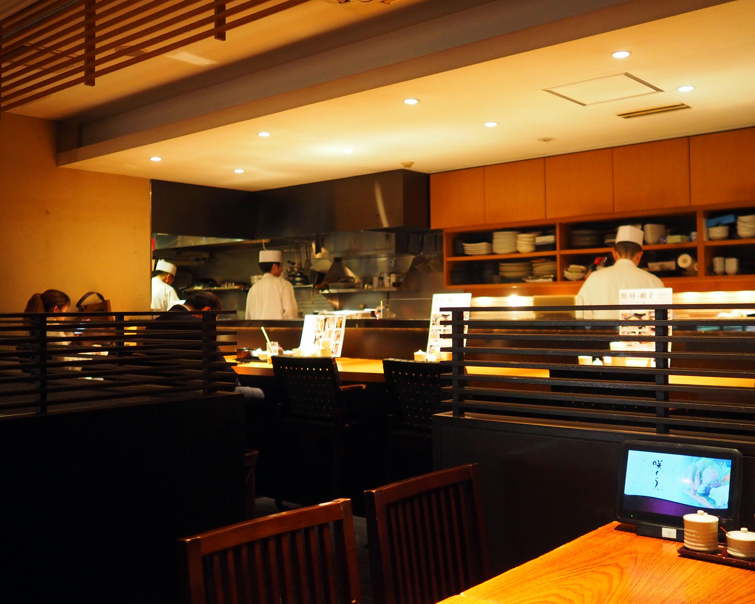 案内されたのは調理場を臨むことができるテーブル席でありましたが、奥には個室が並んでいるようで…