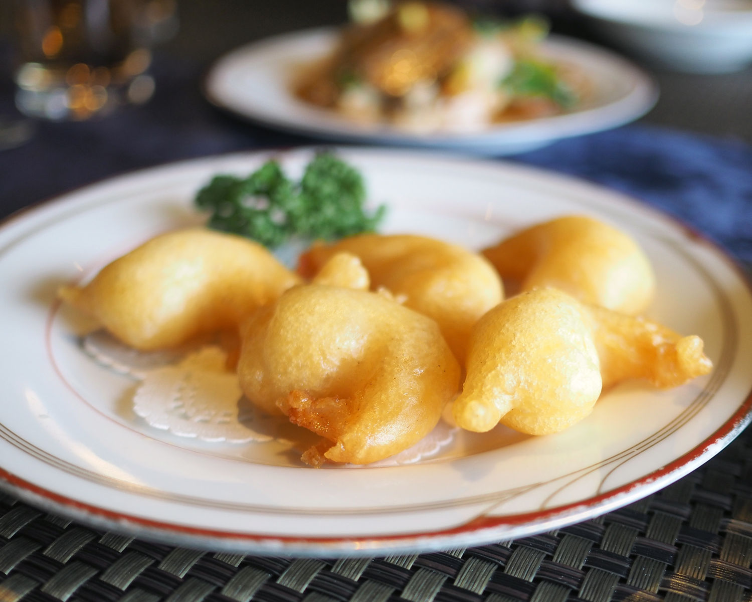 サクッとした衣がおいしい「海老のフリッター」に続いて提供された「ホイコーロー」は甜麺醤の甘みとコクがあり、そこにかけられた辣油の辛味がアクセントとなったもの