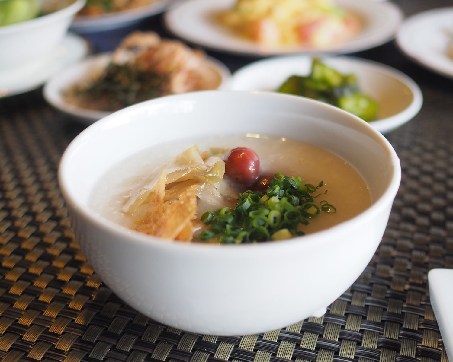 しっかりと出汁が効いたお粥はそれだけでもおいしくいただけるのでありますが、春巻きの皮やザーサイ、ネギなど7〜8種の薬味までもが準備されていているであります