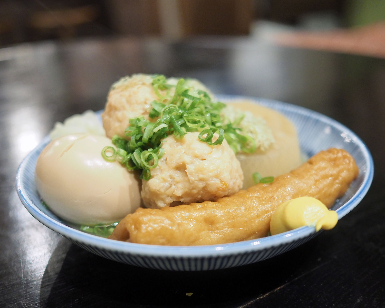 ごぼう天や玉子、大根など8種のほどの種がそれぞれ100円でいただける「おでん」メニューから、ごぼう天、玉子、大根、鶏つみれ、しらたきと5品をいただきます
