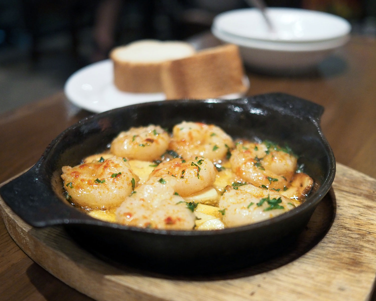 そしてスペインバルといえばアヒージョだということで、店頭に大きな写真入りで紹介されていた「エビのアヒージョ」を…