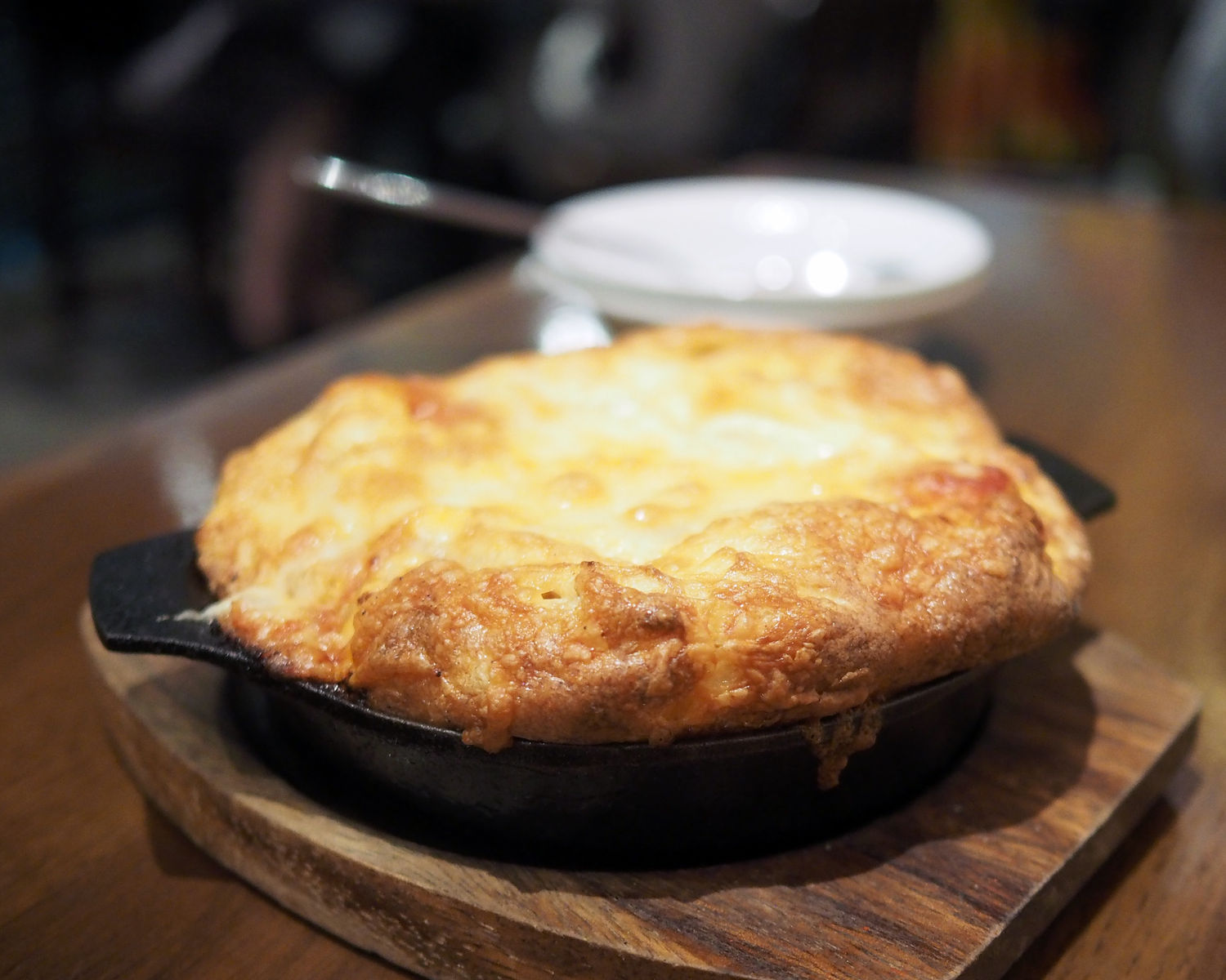 スパニッシュオムレツということでジャガイモなど大きめにカットされた具材を溶き卵で焼き固めたようなものを想像していたのですが、提供されたオムレツはスフレのようにふわふわでありますし…