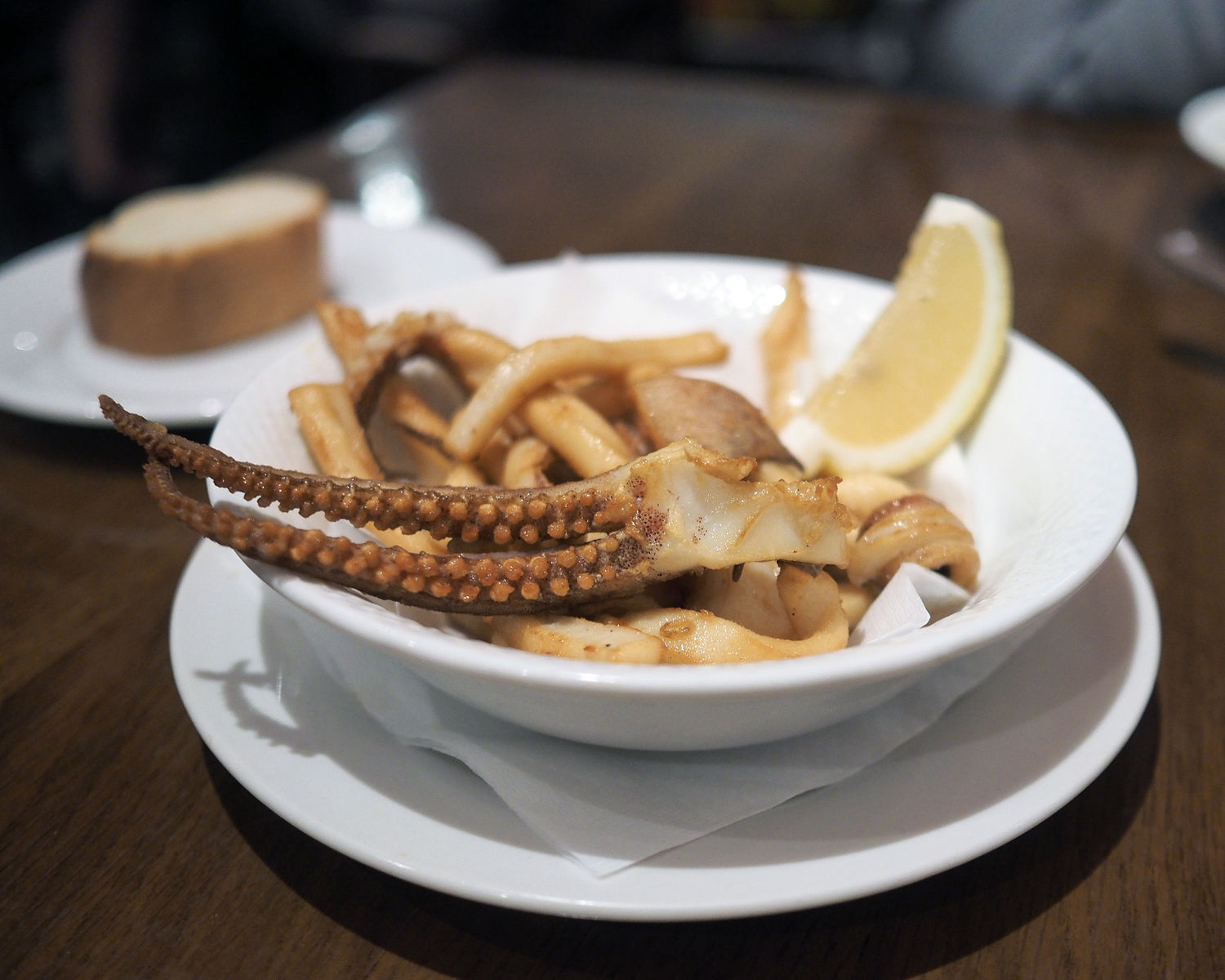 続いては魚料理をと「新鮮なヤリイカのフリット」と「厚切りスモークサーモン」を…
