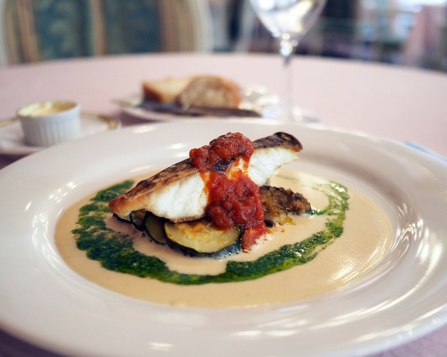 今日のお魚料理は〝真鯛のグリル〟でありまして、白ワインソースにバジルソースやトマトソースで彩られます