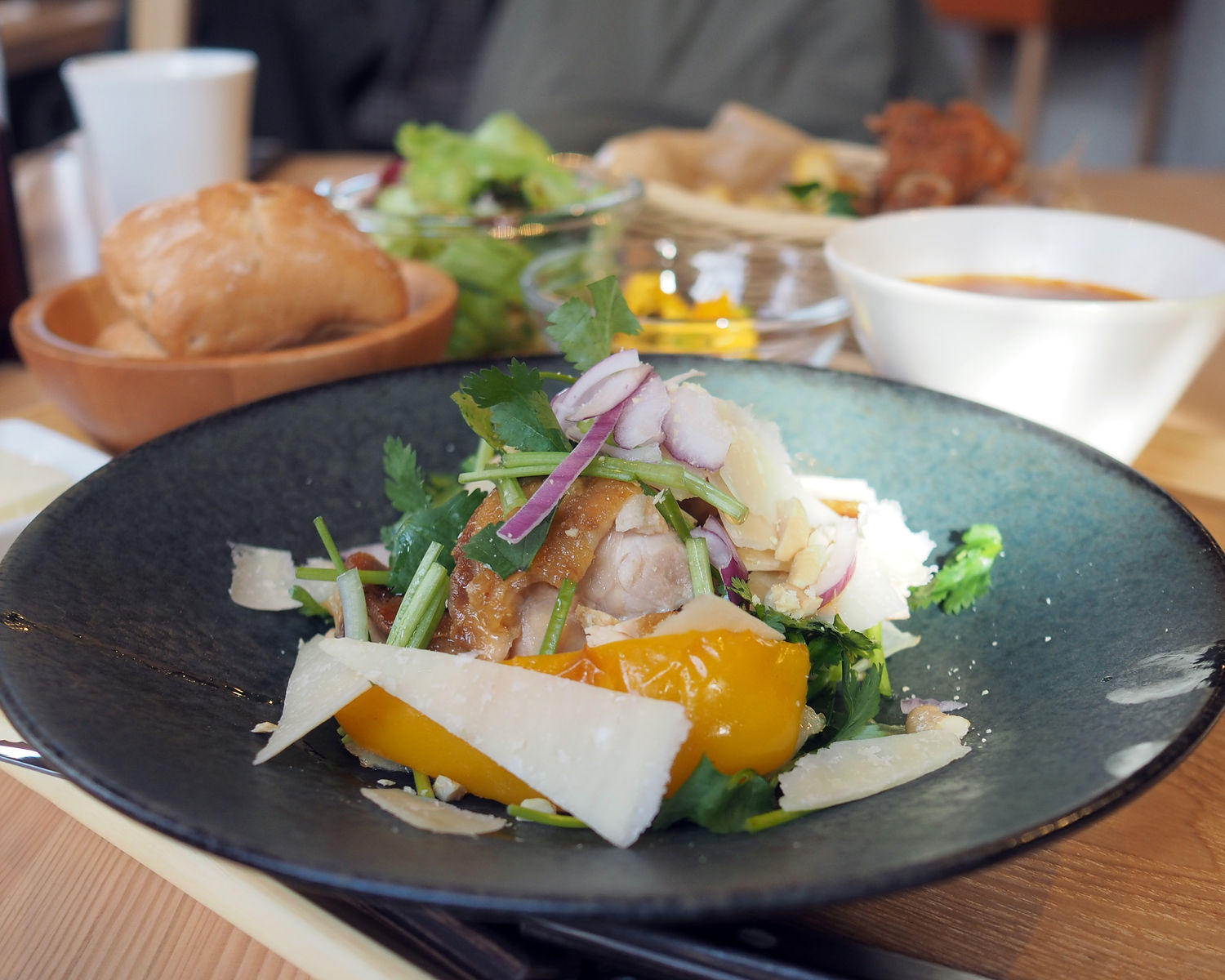 3種から選ぶことができるとのことでチョイスしたミネストローネとパン、それに小鉢までがセットになっていることでボリューム感も満足ですし、カリッと皮目が焼かれたグリルチキンはふっくらとしていて…