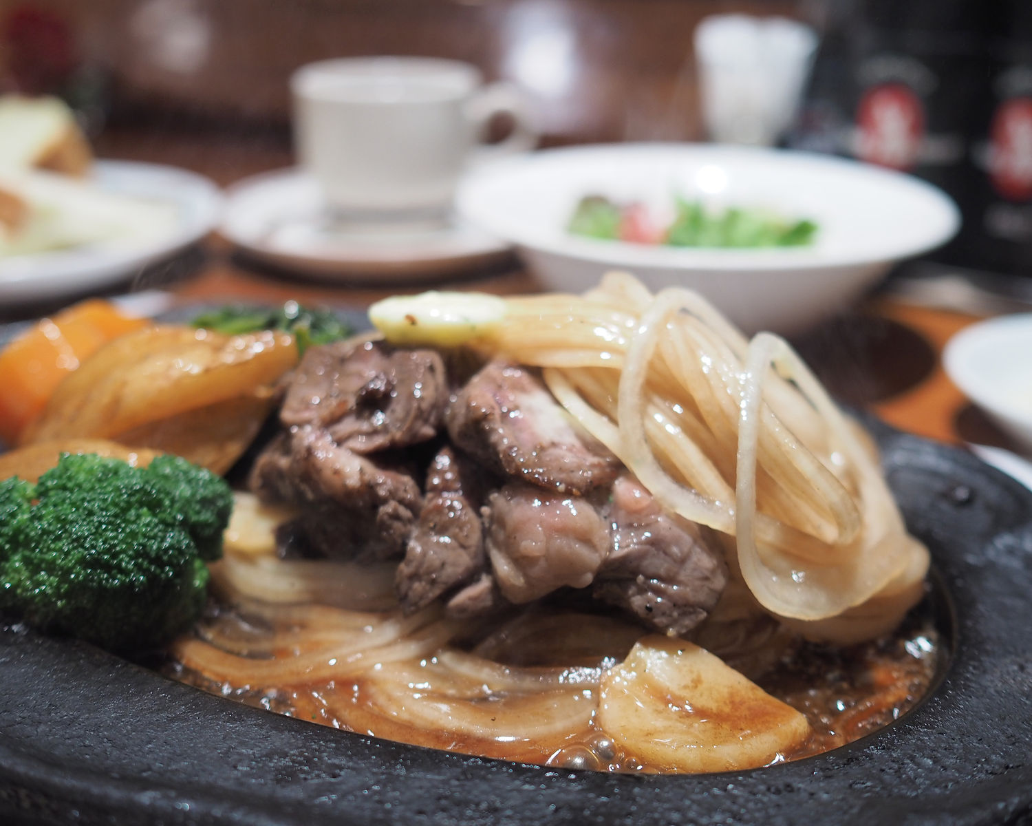 お肉を隠すほどのソテーオニオンも然ることながら、最初に提供された野菜のスープや付け合わせとして乗せられた人参やジャガイモは冷凍されたものではないようで、おいしいお野菜がたっぷりといただけることもうれしいことであります