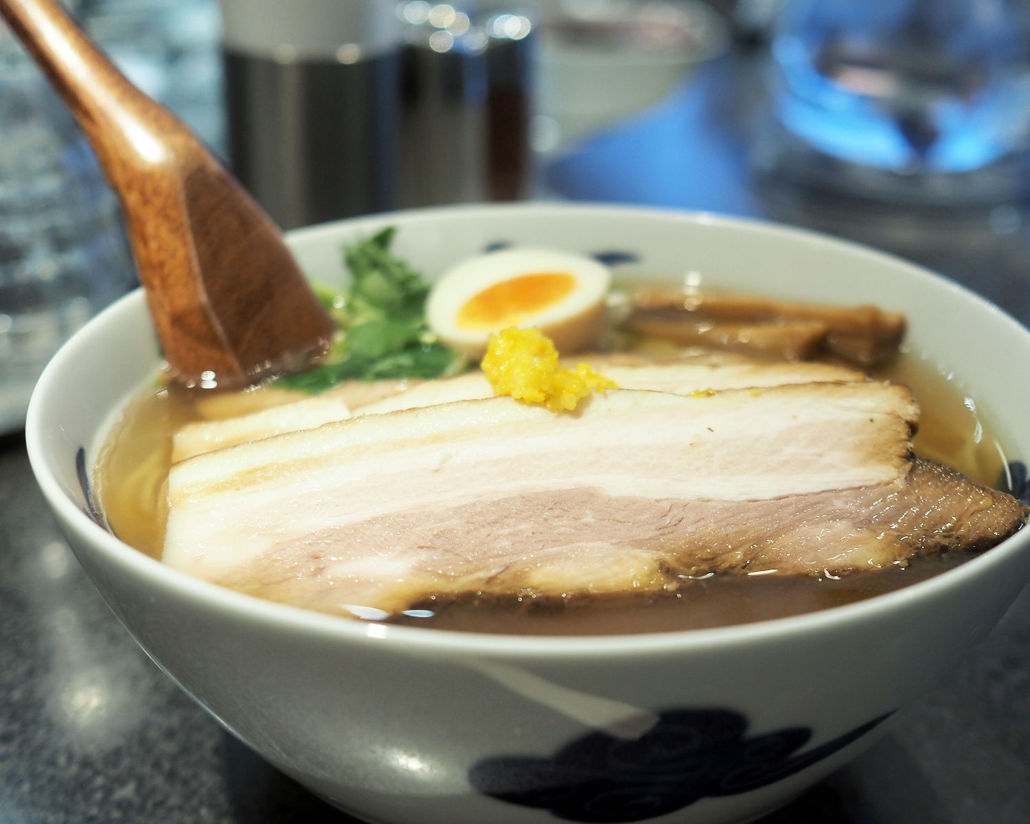 澄み切った美しいスープにキレイに折りたたんだ麺が浮かび、それを隠すかのように鎮座する大きな焼豚