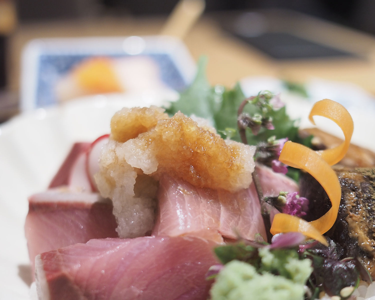 10mmほどの厚切りにされたお刺身はキトキトでありまして、脂がのっていることからお醤油を弾いてしまうことから醤油をかけた大根おろしでいただくことを勧めていただけます