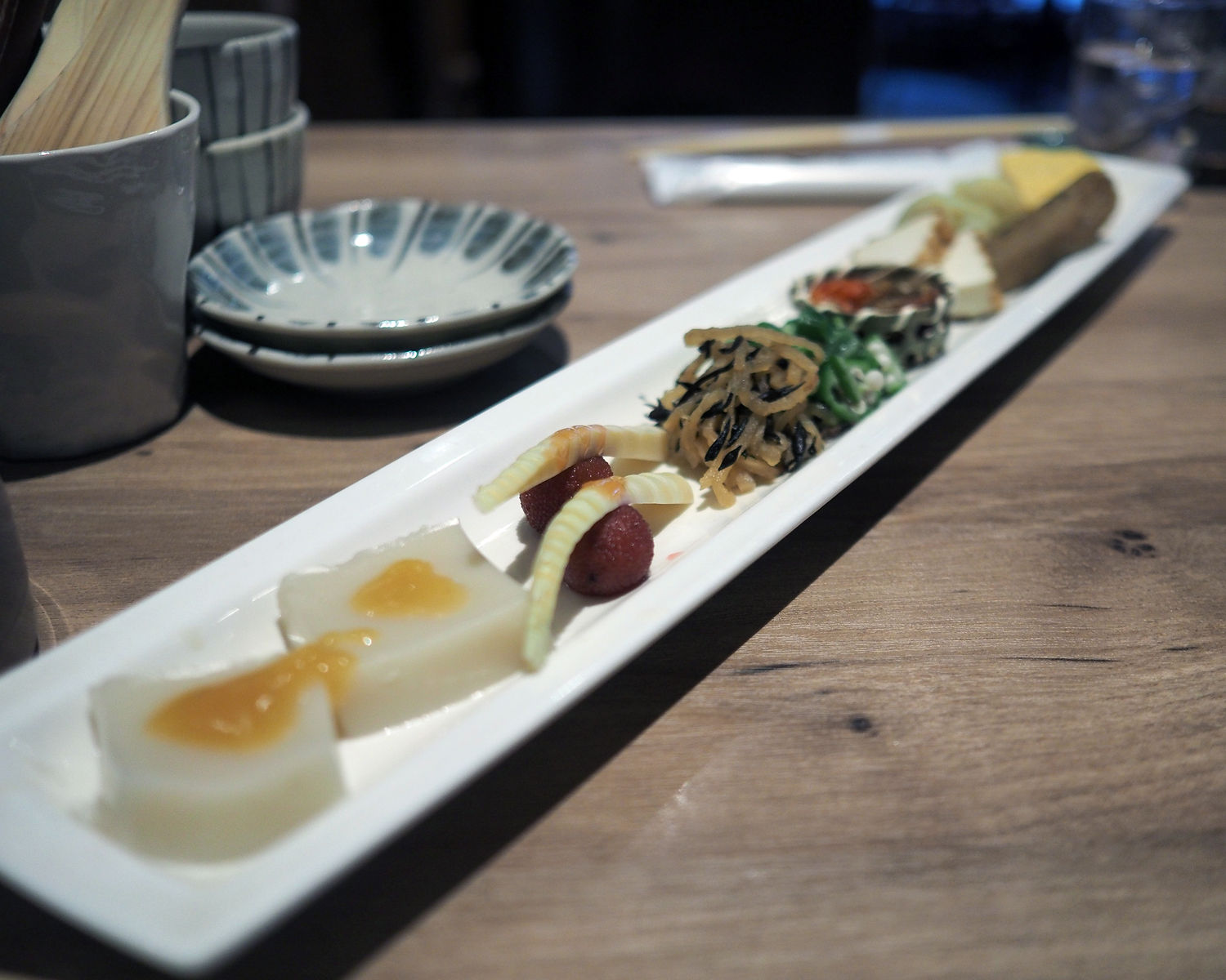 前菜として、胡麻豆腐に筍、切り干し大根、オクラ、など9種が盛られたひと皿が提供されまして、地元野菜が使われているとのことでもありますし、筍の敷かれる木苺やカレー味の里芋などユニークな発想にも驚かされます