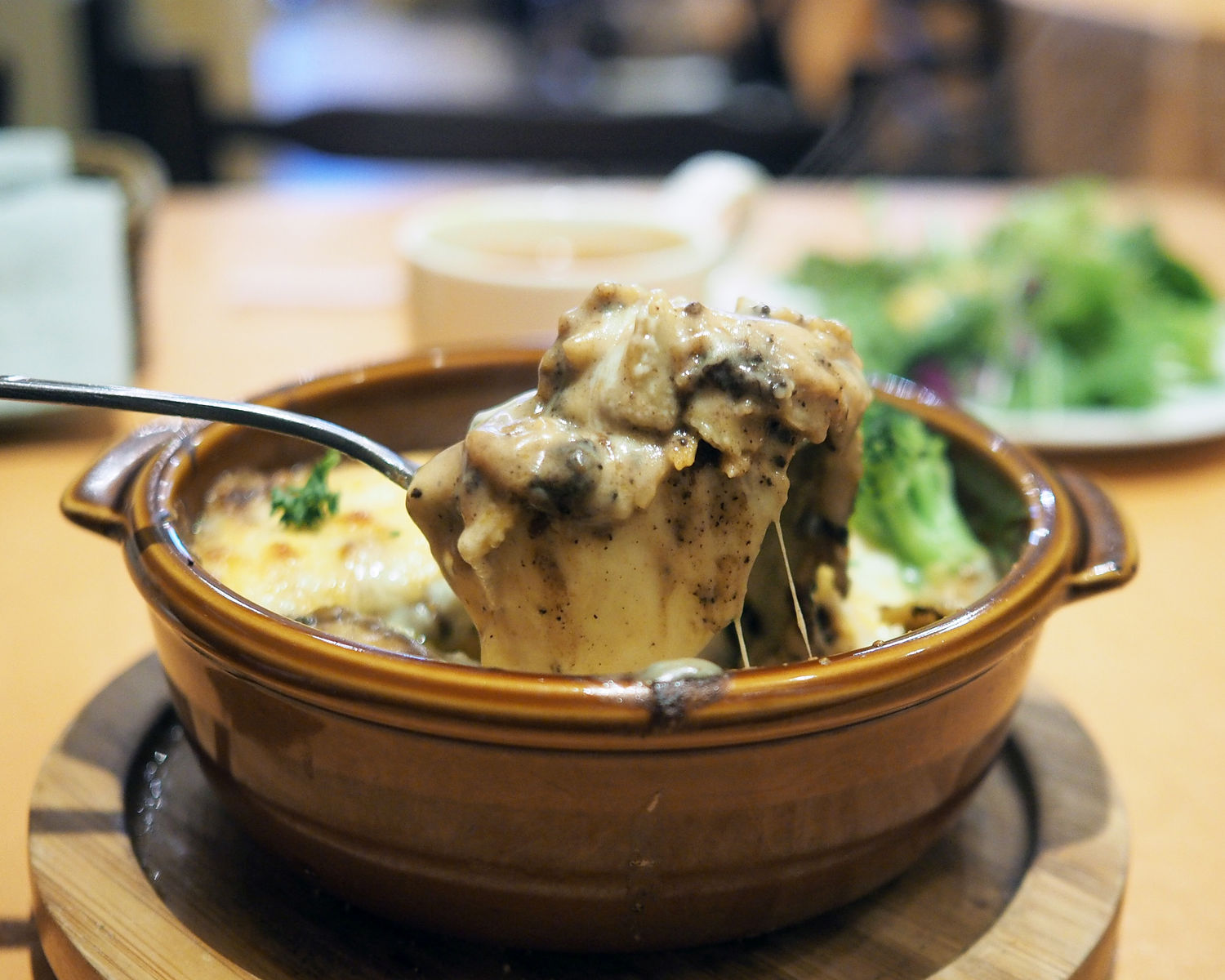 芳ばしい香りを放つチーズの下にはたっぷりのベシャメルとともに黒みを帯びたミートソースがシート状のパスタとともにミルフィーユのように重ねられていまして…