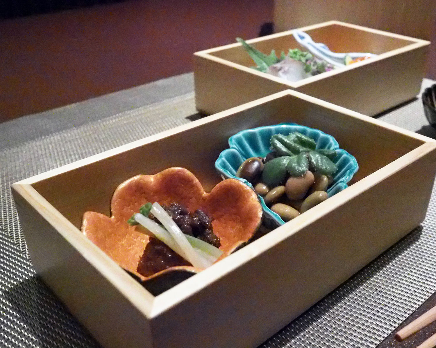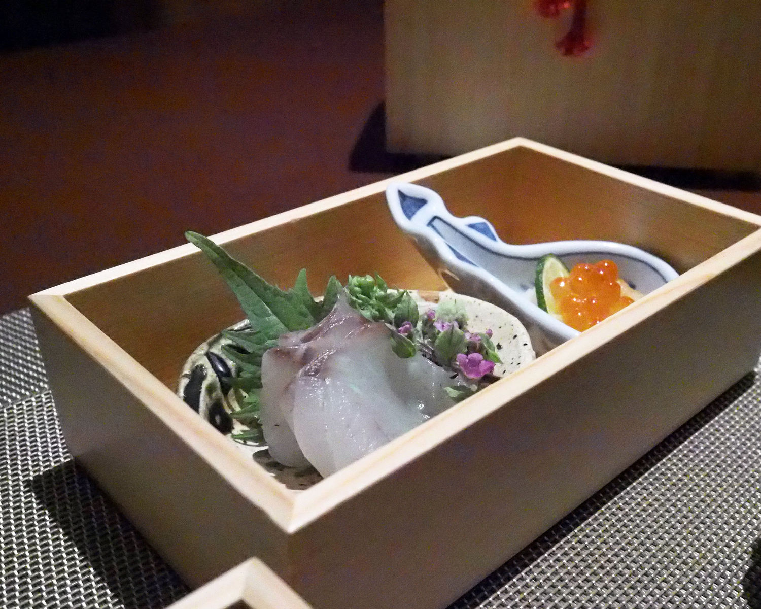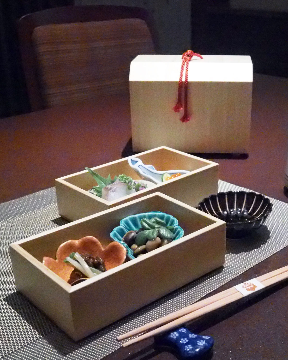 いただいたお料理は「特上今半御膳」でありまして、小鉢とお造りから始まります とてもおしゃれな桐箱は2段になっていまして、1段目には牛の佃煮と大豆のうま煮、そして2段目にはスズキのお刺身といくらおろし 見た目にも美しく、お料理が映えています