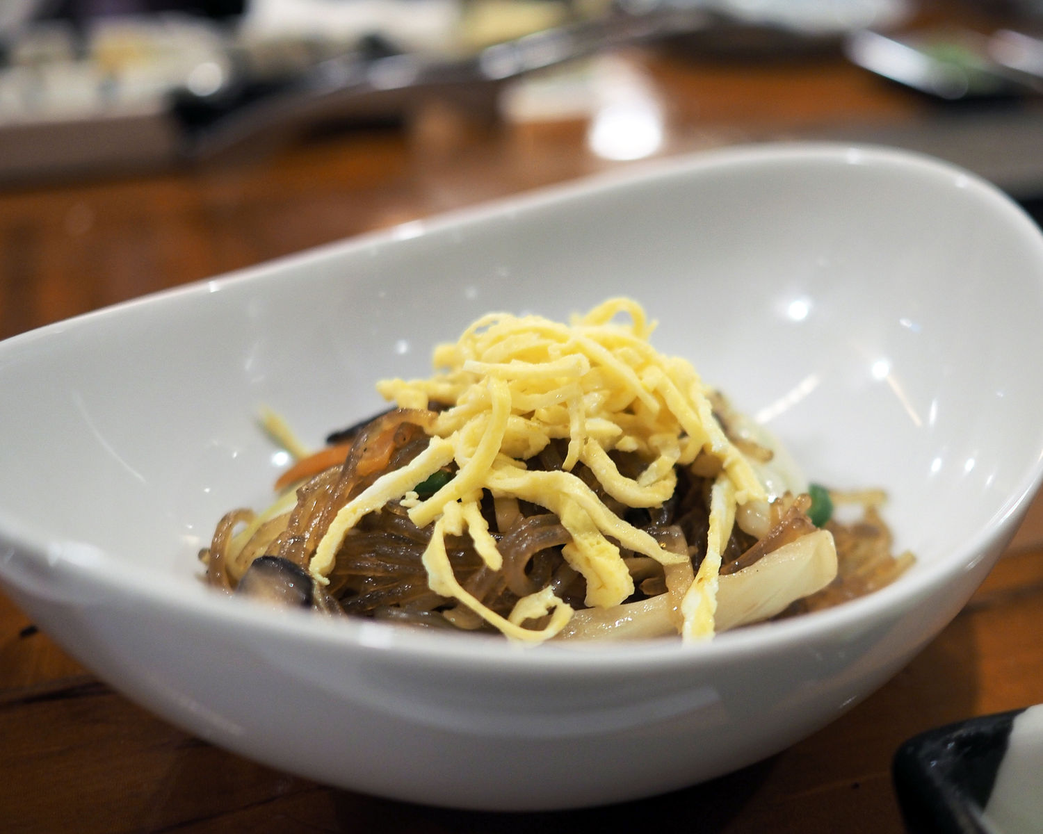 キムチやナムルの盛り合わせ、チョレギサラダ、チャプチェ、センマイ刺といただきます