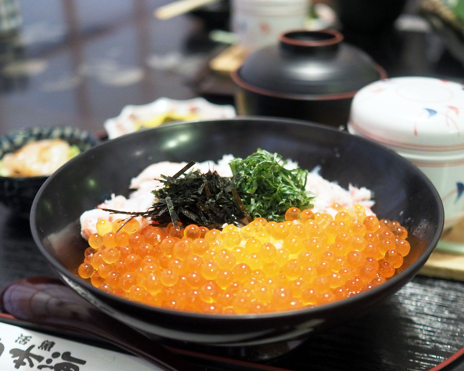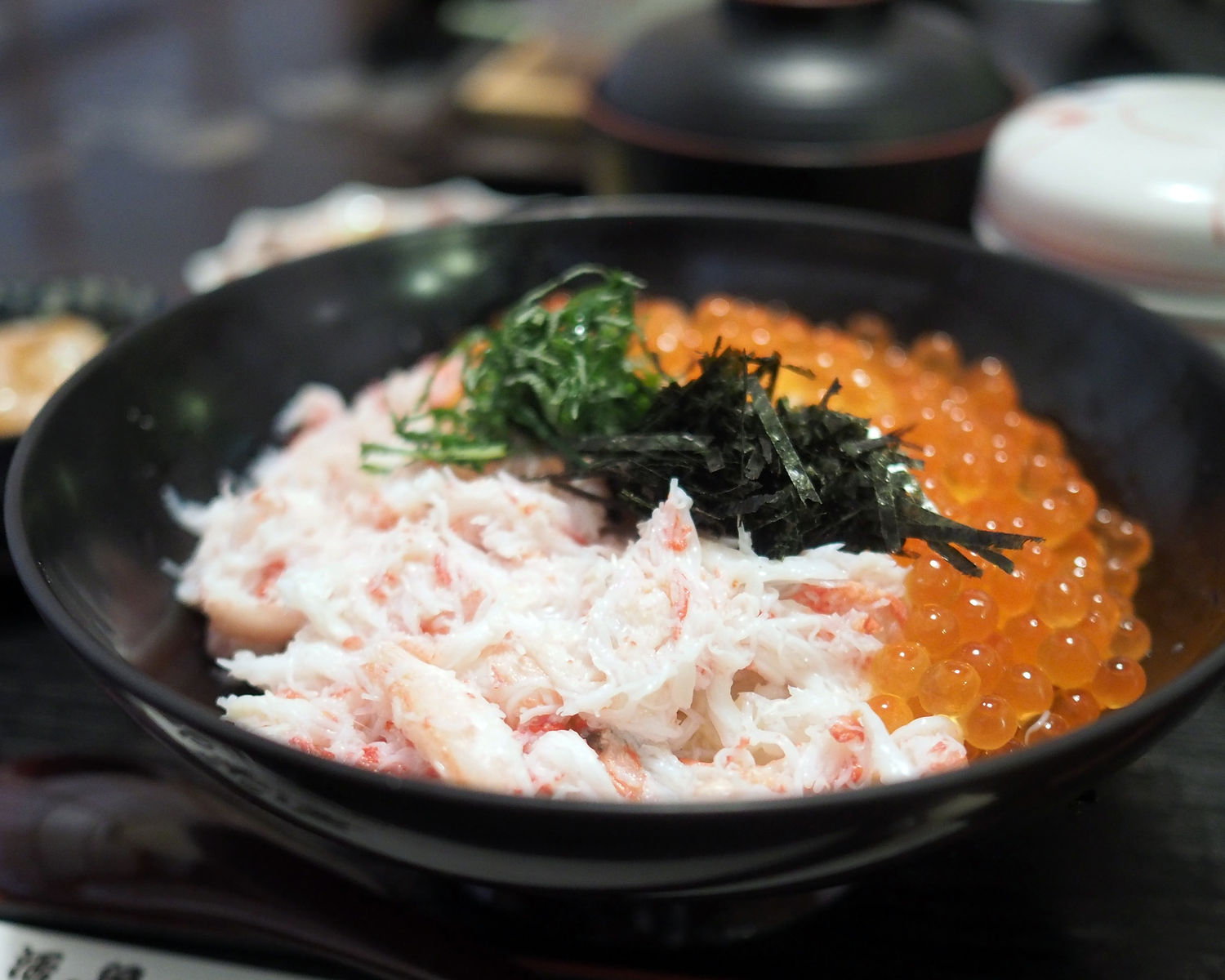 10分ほどで提供された丼は蟹のほぐし身といくらで覆われていまして、ご飯が見えないほどであります