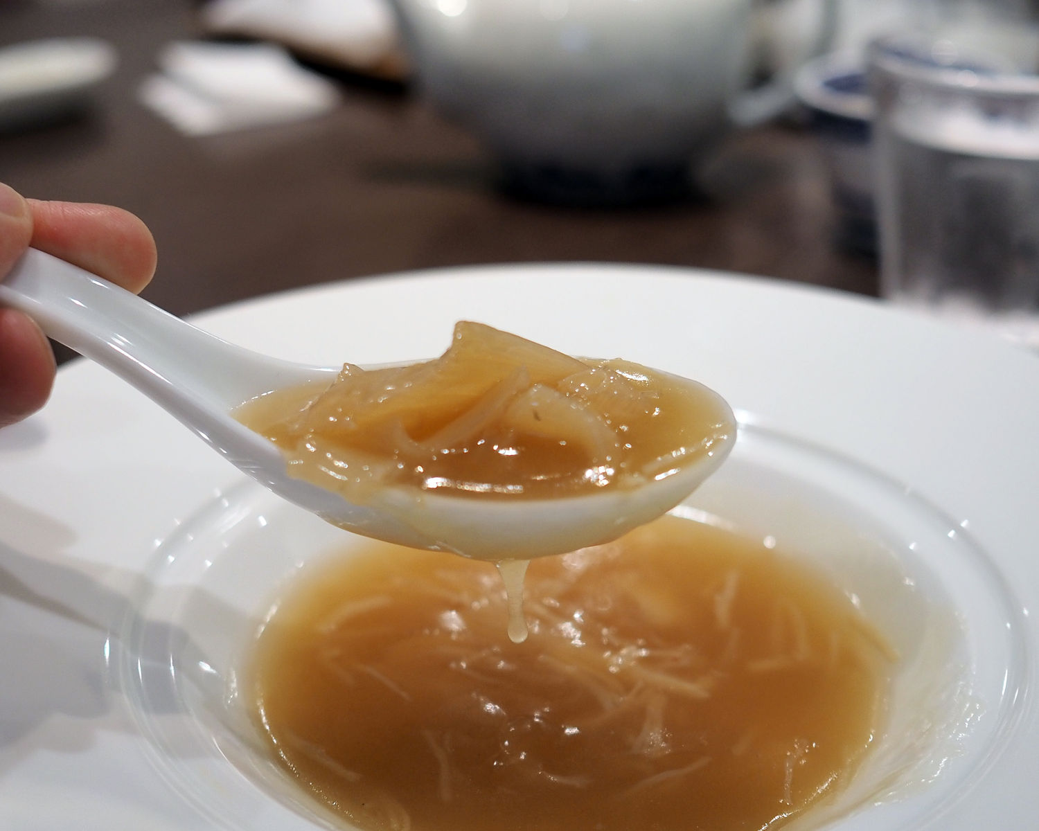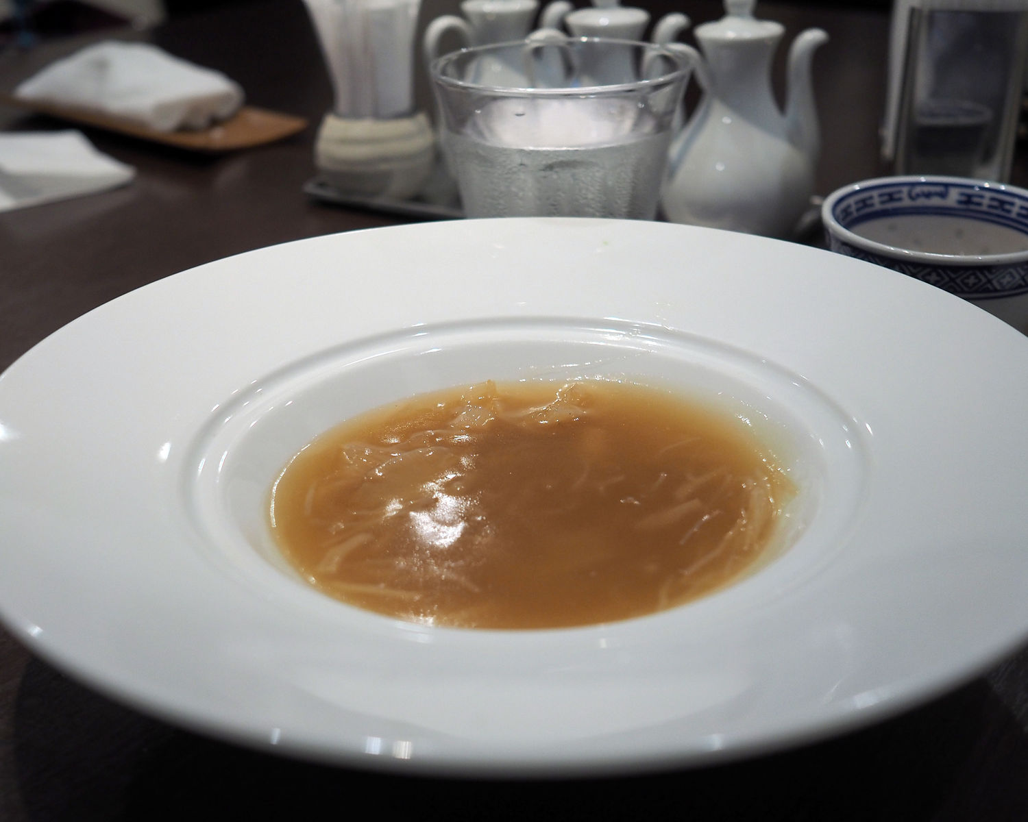 続いて「干し貝柱入りフカヒレスープ」をいただいたのですが…