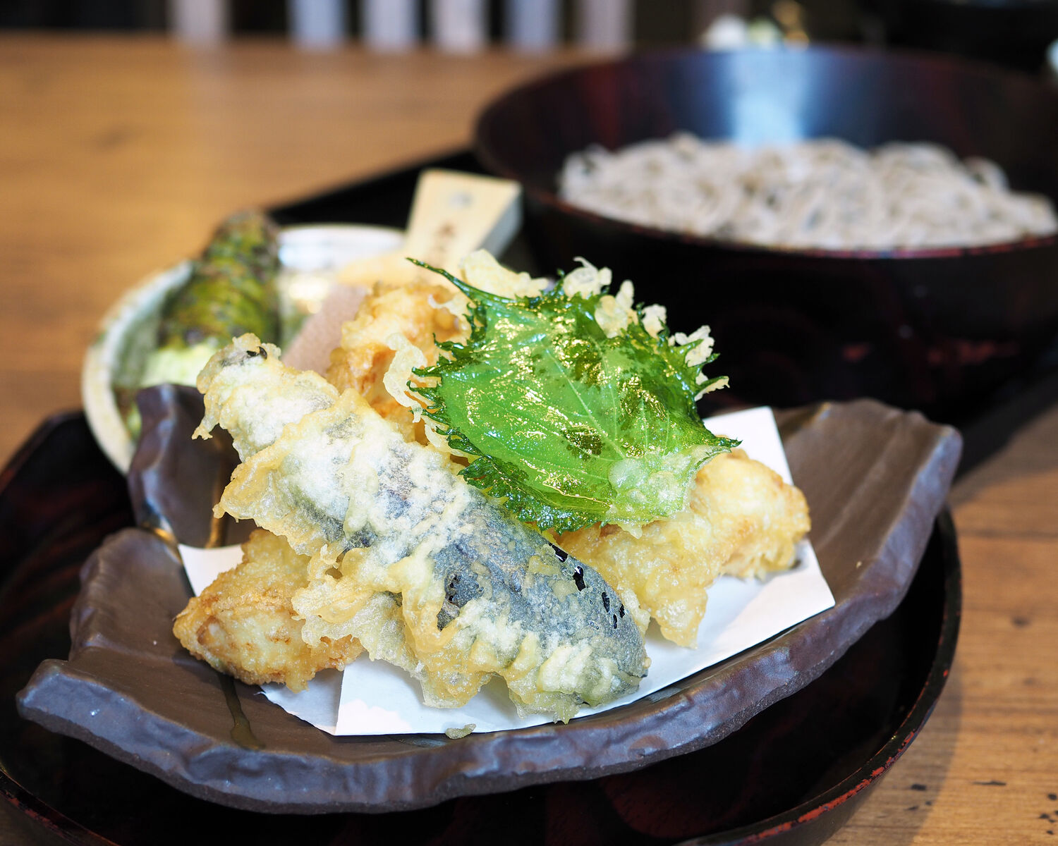 ふっくらと揚がったとり天ではもも肉とむね肉のふたつの食感を楽しむことも出来ますし、お蕎麦の薬味となるわさびは自らが好みの量だけをすっていただくこと新鮮な香りが楽しめるのもうれしいですね