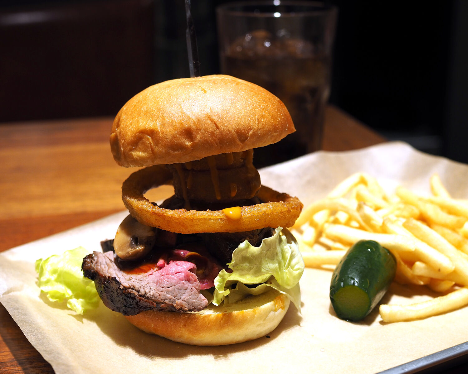 たっぷりなフレンチフライとともに提供されたハンバーガーからはロゼ色も覗く厚みあるステーキがはみ出していまして…