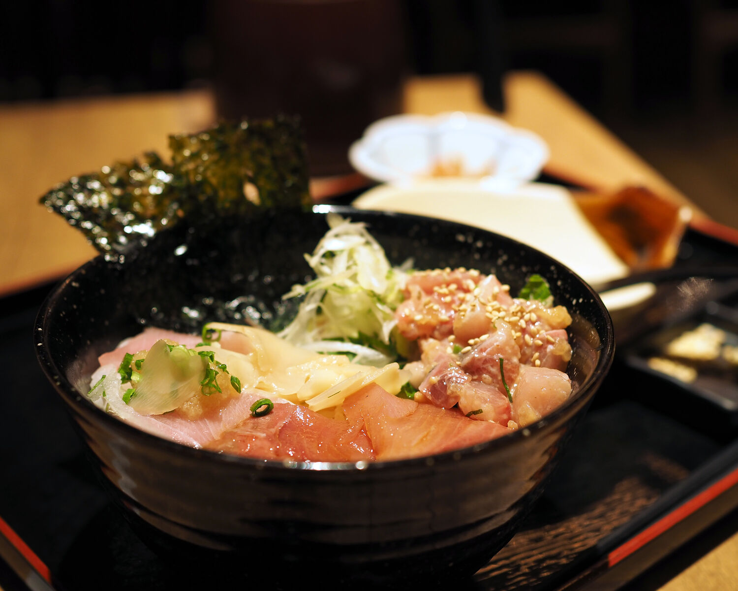 ランチのメニューにあった「海老と帆立のばら天丼」に魅かれながらも、産直鮮魚を謳うお店であることだしと期間限定で提供される「鰤三昧丼」をいただくことにいたします