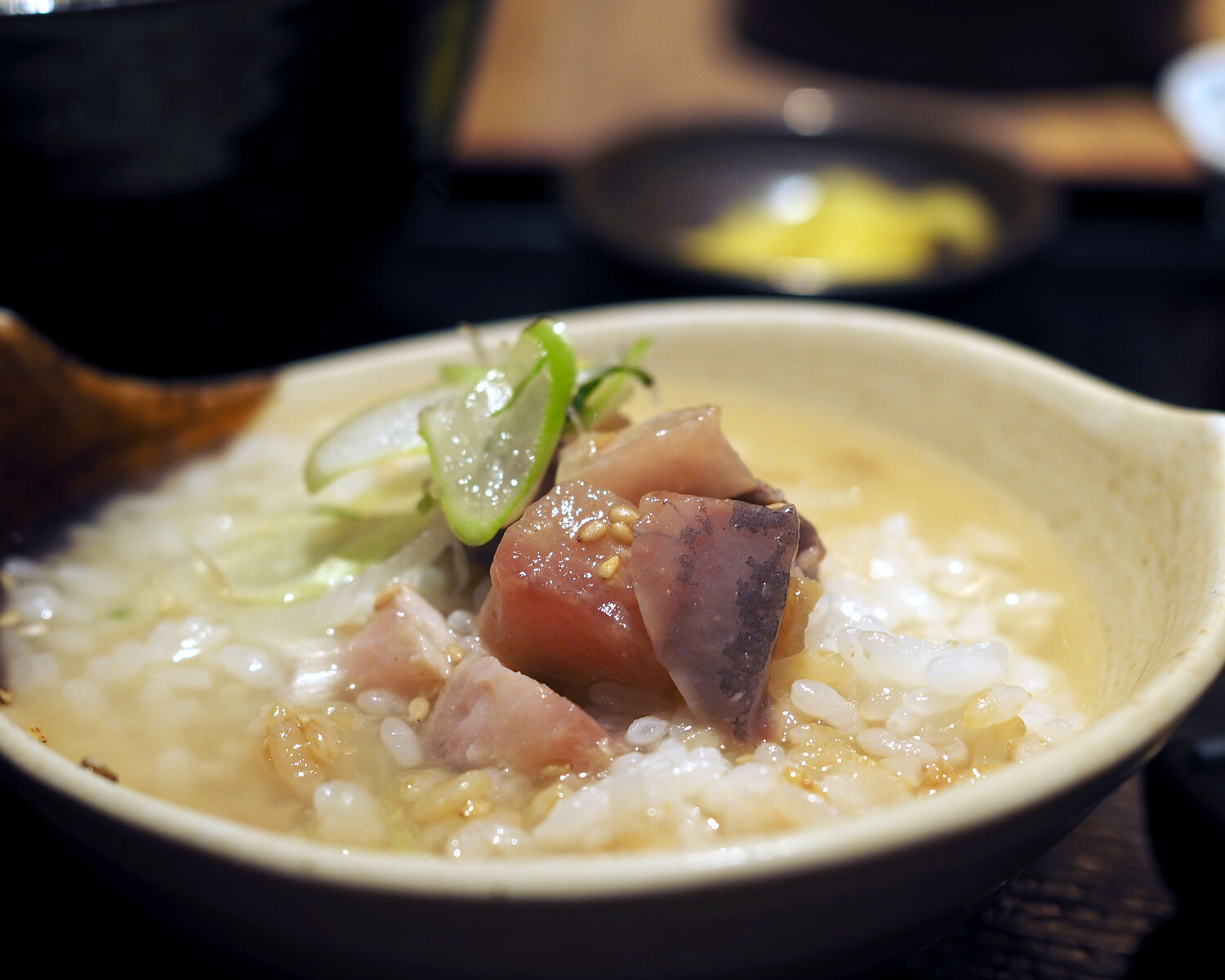 そして残り半分はお茶漬けで ネギのシャキッとした歯ざわりや辛味がアクセントとなっておいしくいただけますし、お茶漬けをおいしくいただけるためにか、ちょっと硬めに炊き上げられたご飯の舌ざわりも良く…