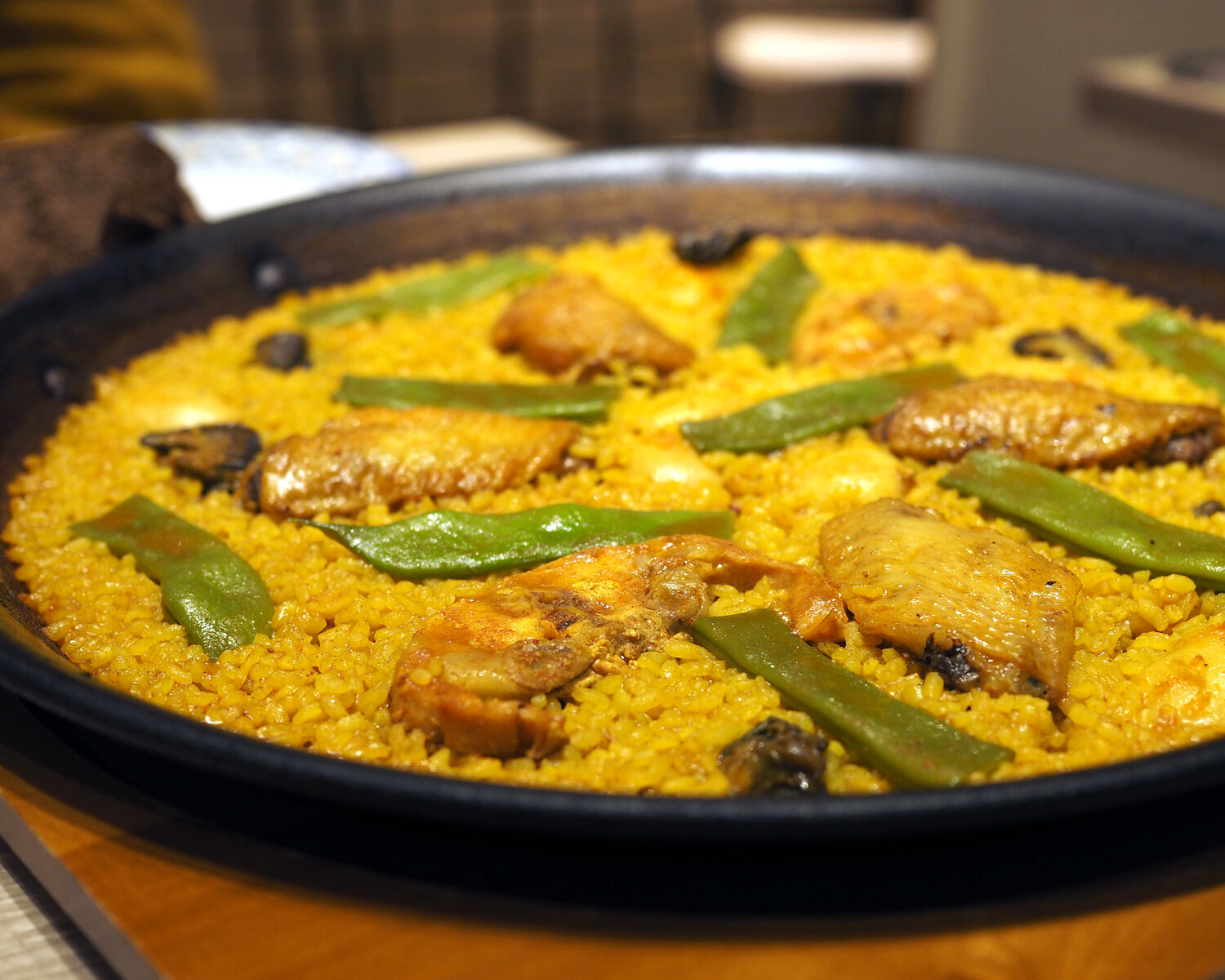 パエリアの発祥地だとされるバレンシアでは鶏肉、ウサギ肉、ガラフォン豆、モロッコいんげんをベースにカタツムリやアーティチョークなどが入ったパエリアが一般的であるとのことで、それを忠実に再現した「バレンシア風パエリア」をいただくことにいたします
