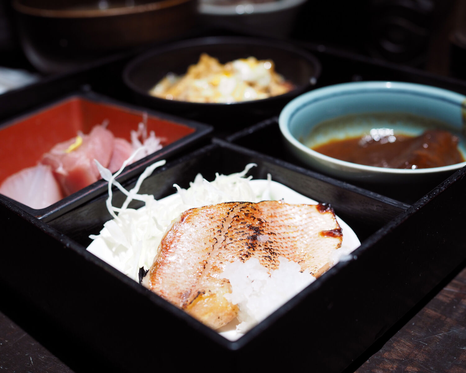 5分ほどで提供された松花堂の箱には"お刺身"のほか"赤魚の西京焼き" "さばの味噌煮" "かつ煮"が乗せられ、蓋にご飯とみそ汁、それにひじきとお醤油のジュレが掛けられたお豆腐が乗せられます