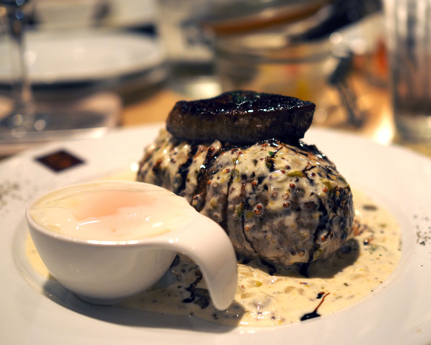 迷いに迷ってサッパリとした味わいのポークハンバーグにベーコンの塩味が加わることでの旨みを期待して「パンチェッタベーコン」を柚子胡椒ソースで、そして「フォアグラバルサミコ」をクリームマスタードソースでいただきシェアすることにいたします