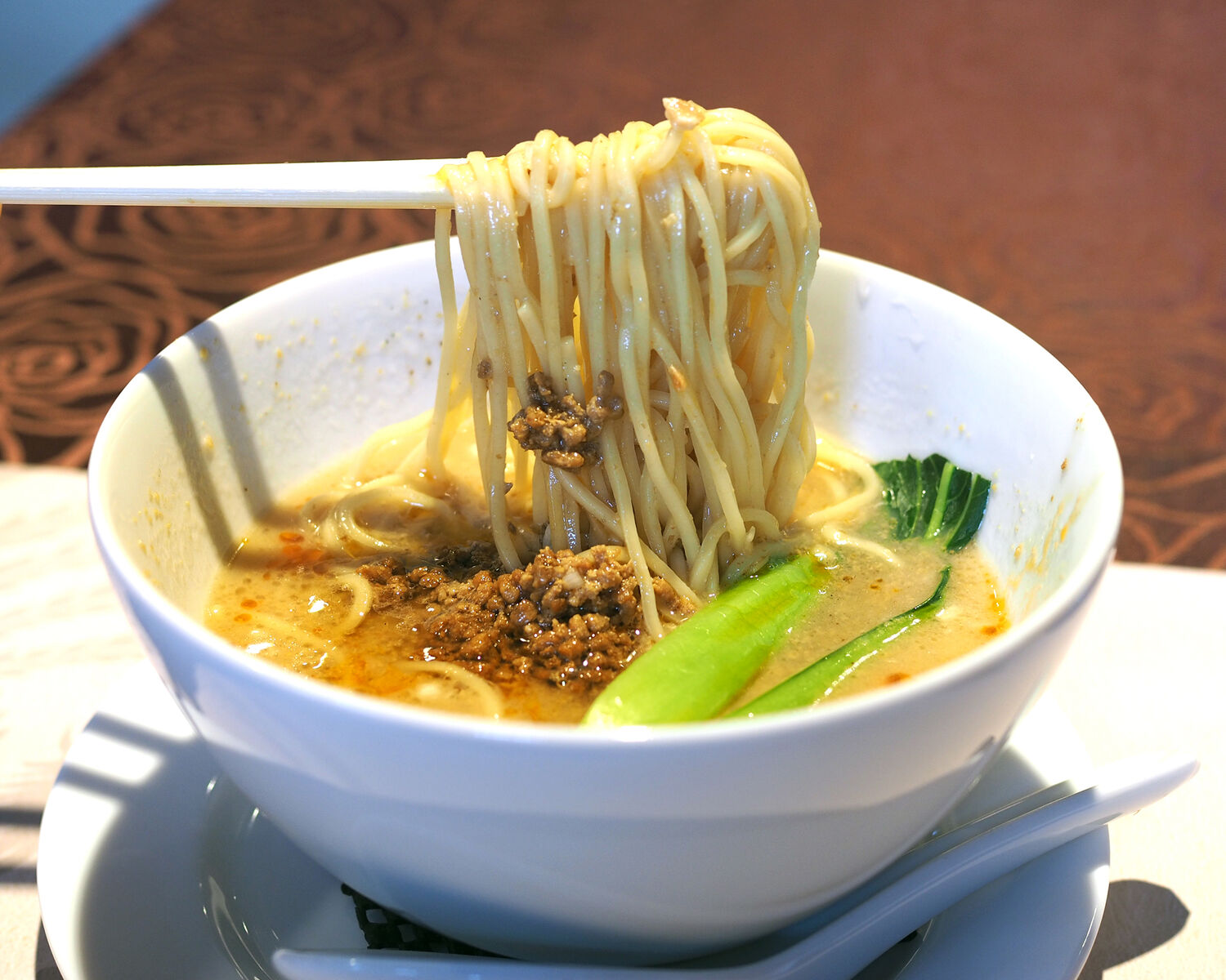 お気に入りの加水少なめなストレートな中細麺に絡む胡麻の風味と円やかなスープの旨みとコク そこに細かいメッシュの挽肉が使われていることでの炸醤までもが絡み合って…