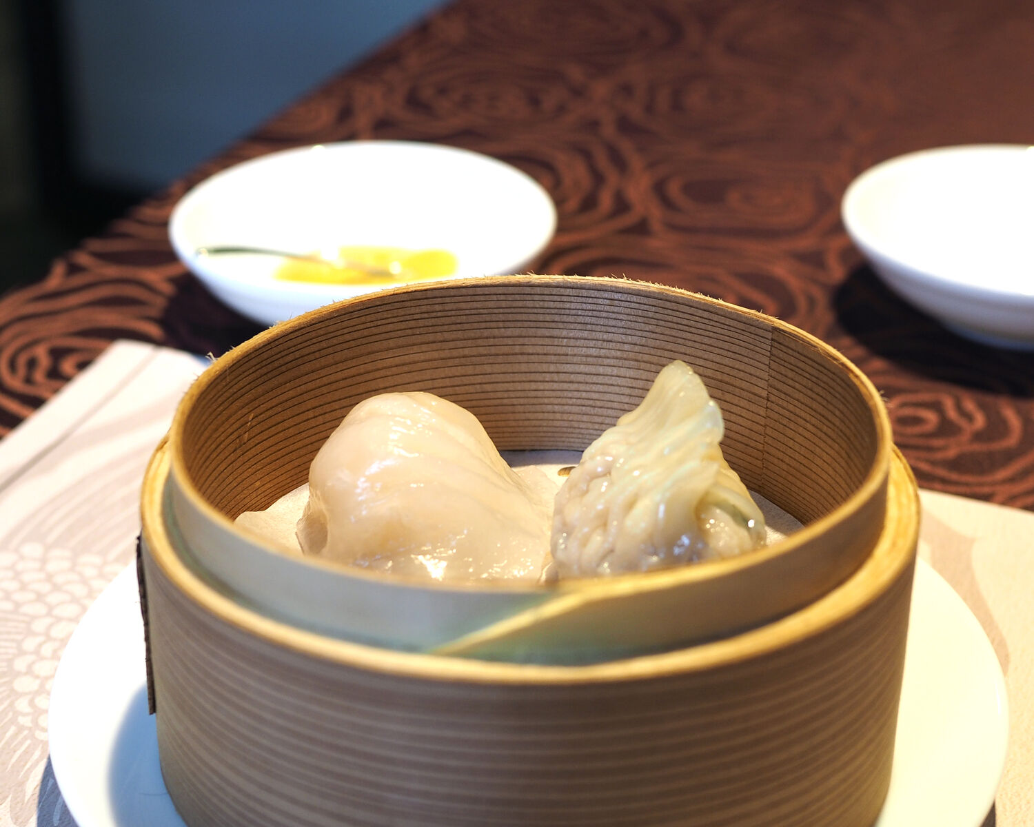 蒸し点心はプリッとした海老を包むツルンとした滑らかな舌ざわりを楽しめる “海老蒸し餃子” とプチッととした歯ごたえがあるふかひれを包み込んだ“ふかひれ餃子” の2種でありまして…