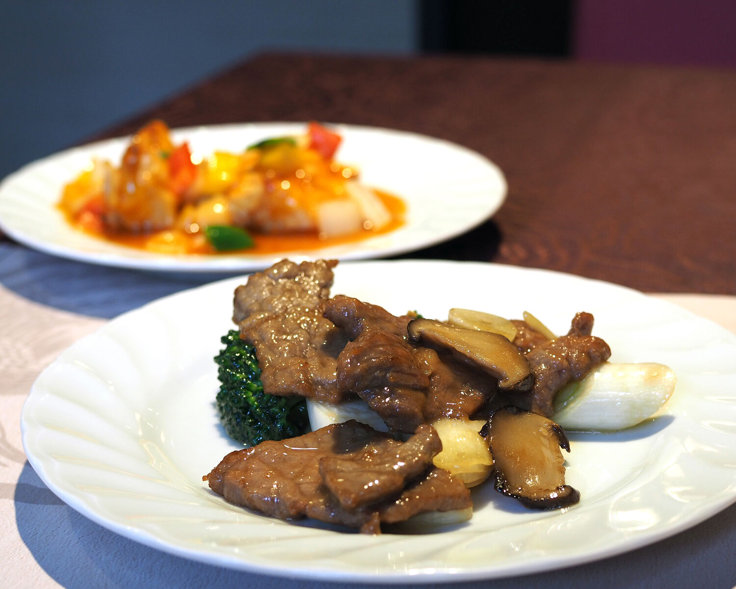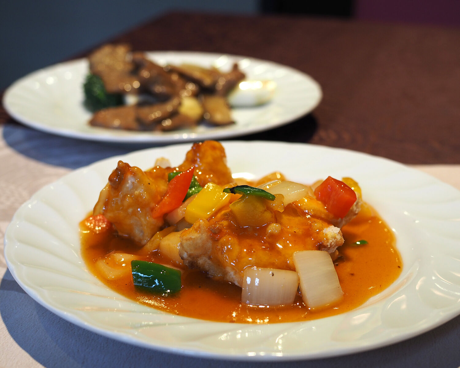 本日のスープとしてのコーンスープをいただいたあとに提供されたのは “牛肉と生姜と葱の炒め” と “白身魚のスイートサワー カラフルソース掛け”