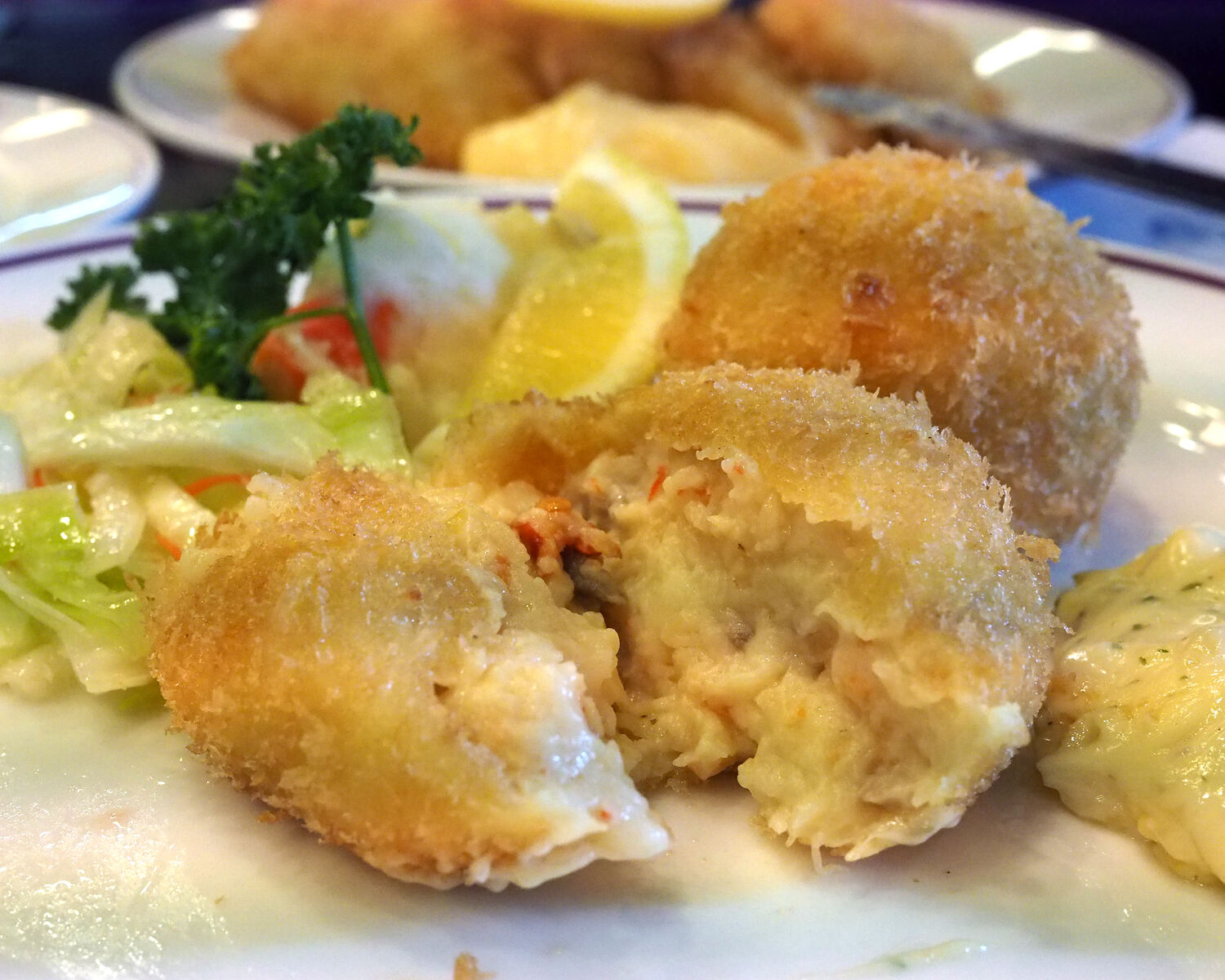 蟹の味わいがたっぷりと詰まった蟹クリームコロッケは熱々でありますし、滑らかな舌ざわりがおいしいベシャメルソースのコクにも満足であります