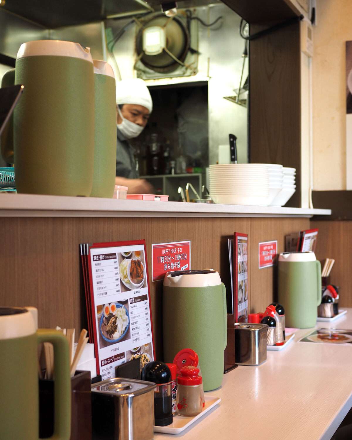 大柄な男性が窓側にいらっしゃいましたので、ワタシは厨房側の角席をいただくことといたします