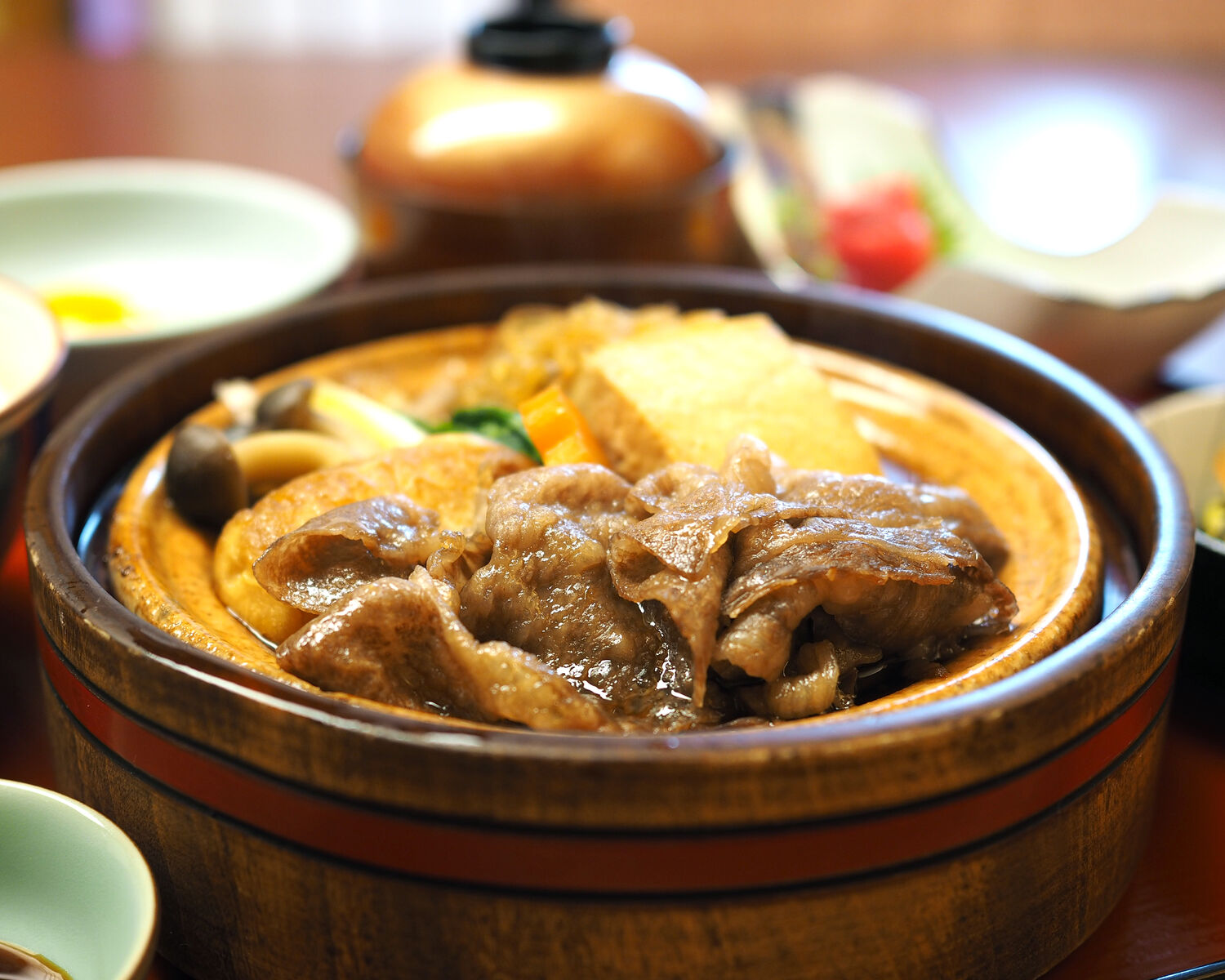 添えられたお豆腐や白滝、それに春菊やネギ、しめじ、人参とお野菜と割り下で煮込まれたことでの甘みをおいしくいただけますし、たっぷりと割り下が染みたお麩も 良い感じですね