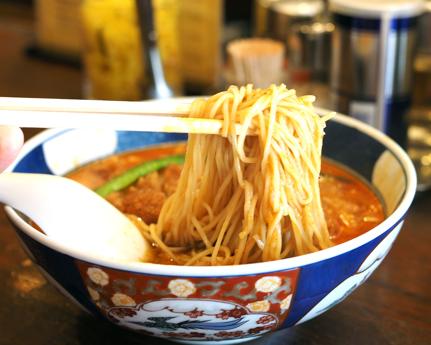 中華料理店にある「担担麺」のようにたっぷりな炸酱が乗っているわけでは無いのですが、濃い胡麻の風味ビリッと辛いスープと、それに絡む加水の少ないストレートな細麺