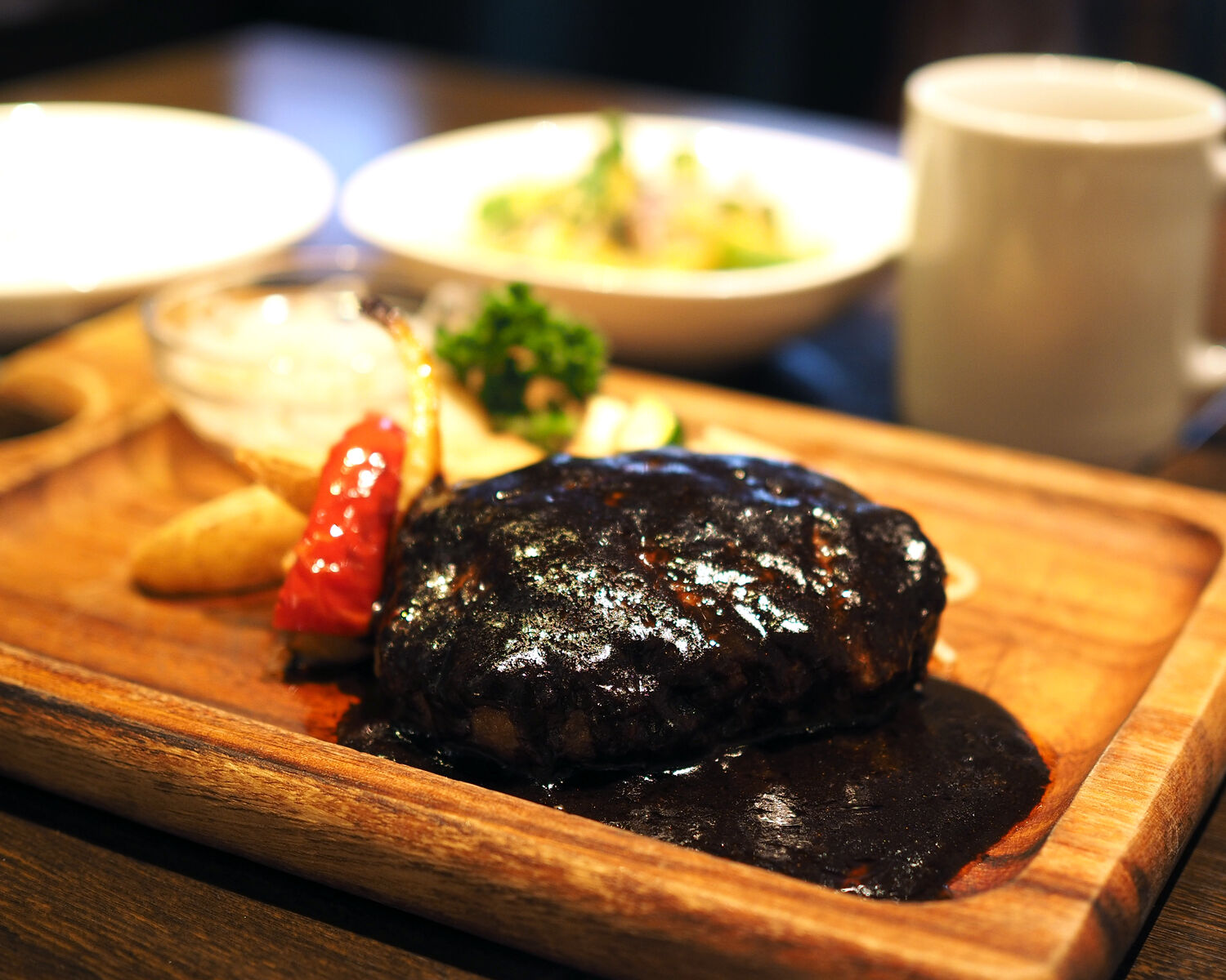 そんな中から選んだのは「近江牛のハンバーグ定食」 提供まで15分弱の時間がかかりましたが、厚みがあるハンバーグには黒光する濃厚なデミグラスソースがかけられていまして…