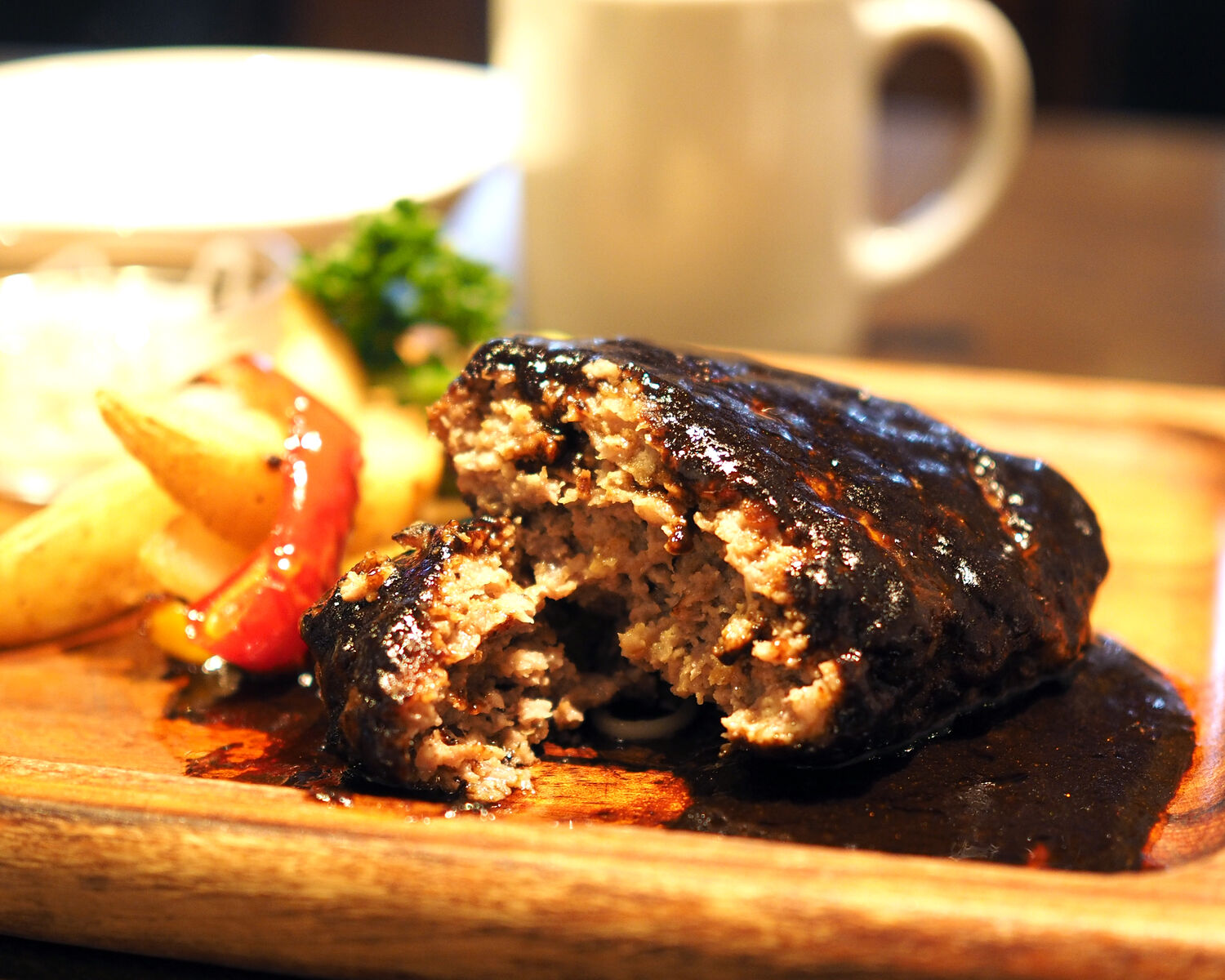 ハンバーグはしっとりと焼き上げられていることから断面から滲み出る肉汁においしさを感じますし、粗めのメッシュであるミンチの歯ざわりにも満足でありますし…