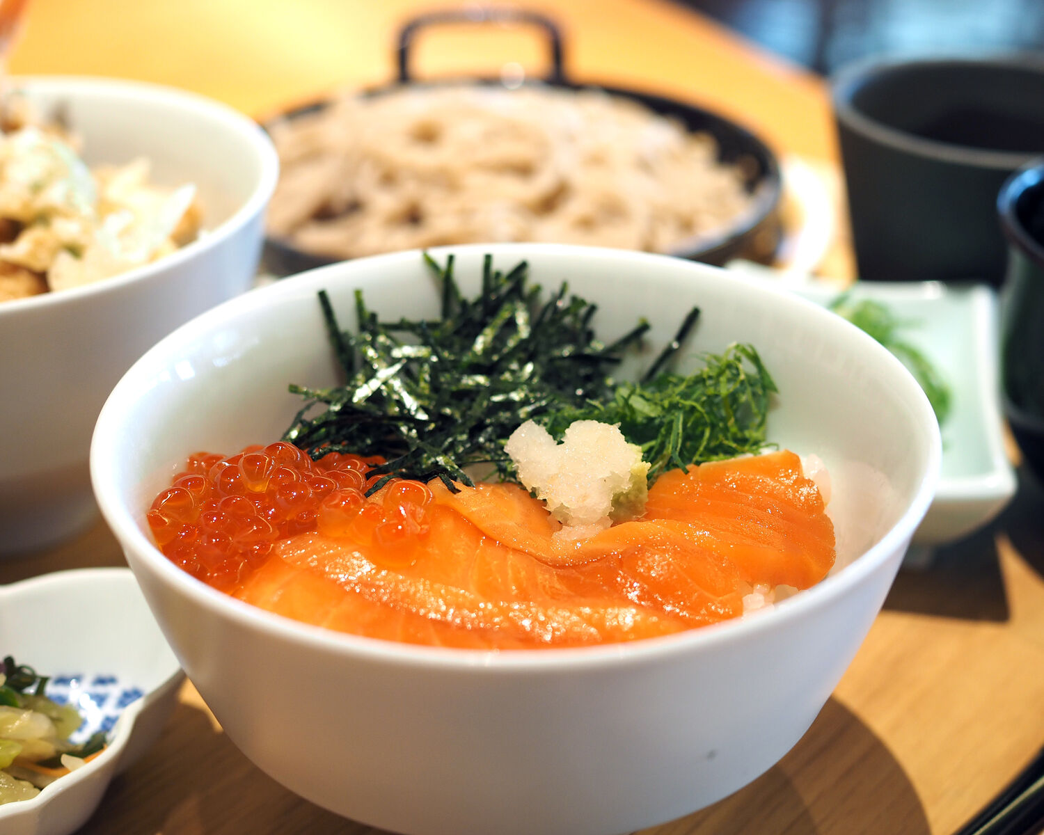 事前に味付けがなされているとの鮭は添えられてお醤油を使うことなくいただくことができますし、醤油漬けされたイクラにわさびを乗せていただきますと、甘みがある出汁醤油とわさびの辛みと香りで一層おいしくいただけます
