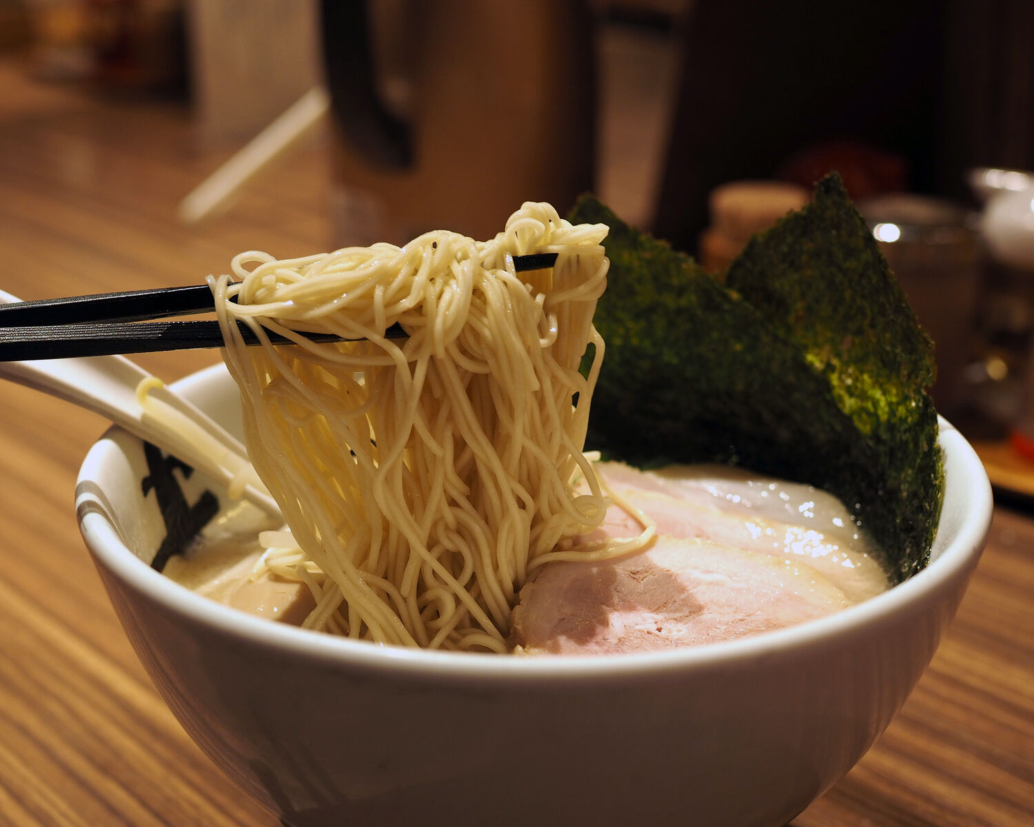 先ずはスープ 舌ざわりが滑らかなクリーミーなスープは豚骨の奥深い旨みを感じるだけでなく、脂が上手く乳化されているのでありましょう