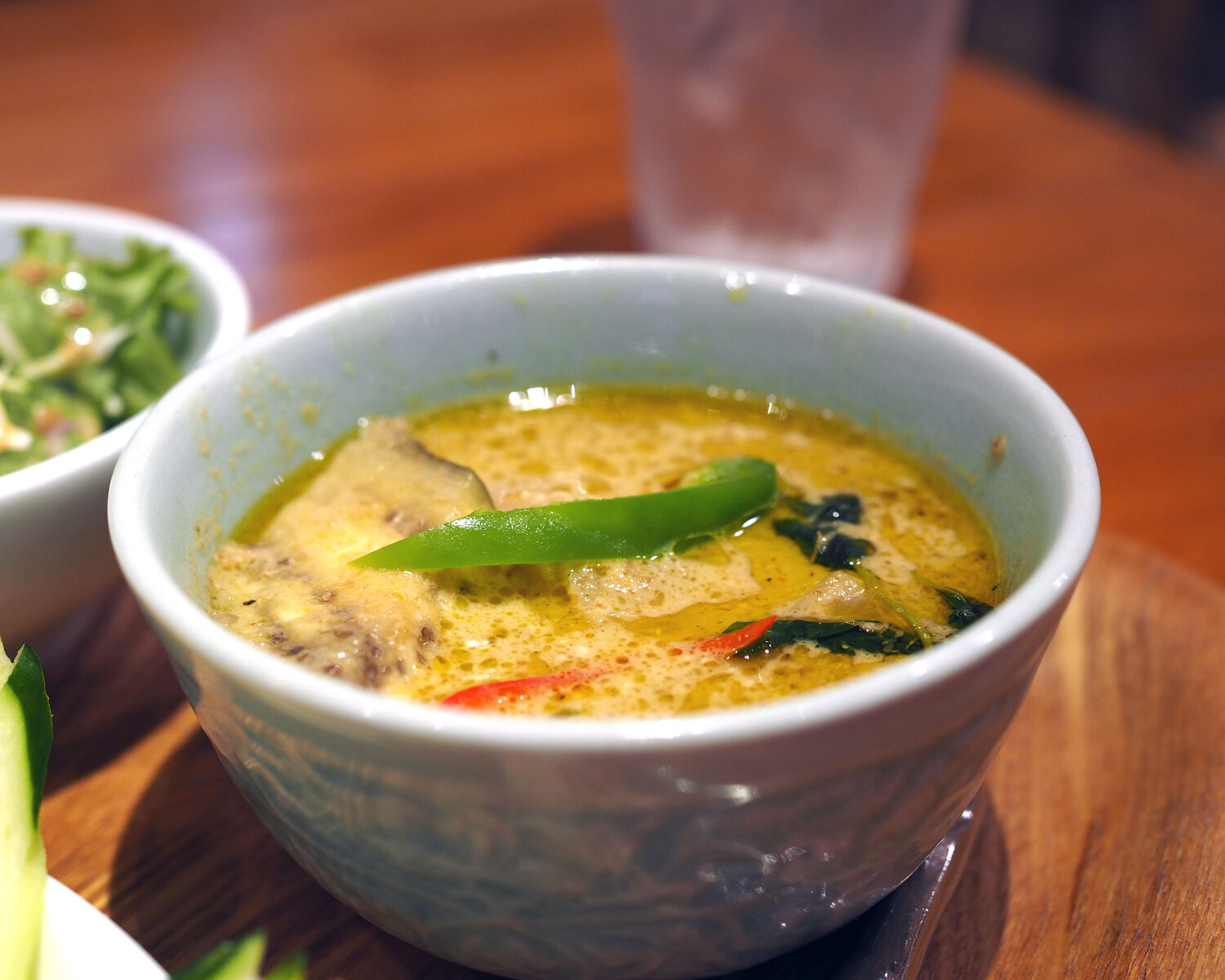 添えられたグリーンカレーには柔らかな鶏肉とほど良く火が入ったナスが入っていまして、スッキリとした辛みとともに食感までもを楽しむことができるものでありまして…