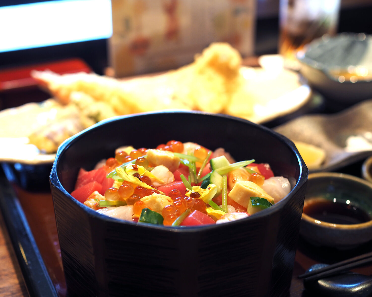 さいの目に切られたマグロ サーモン かんぱち 海老 タコ いくらと言った魚介に、玉子 きゅうり 菊の花などの彩りが添えられていることでの見た目はテンションが高まるほど