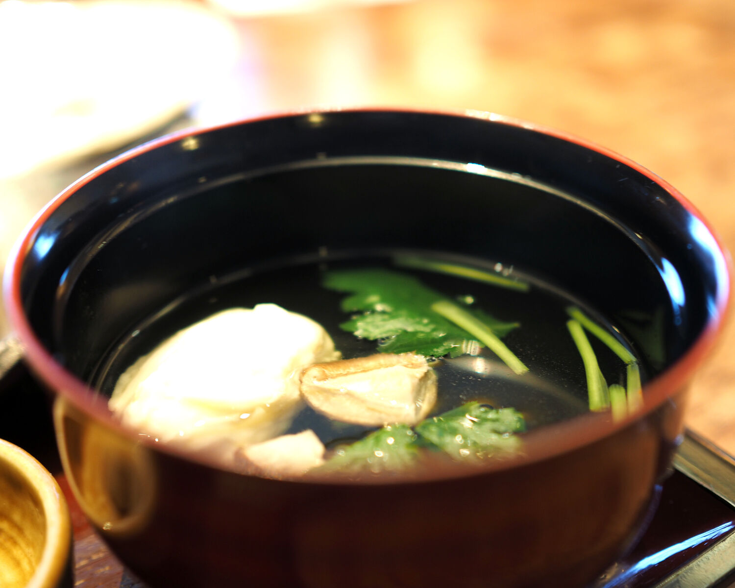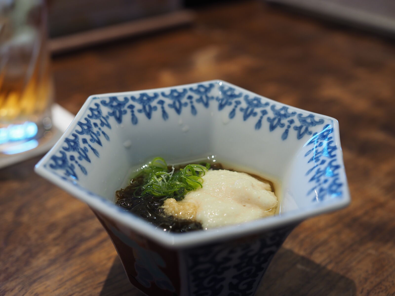 先付として提供されたのはとろろ芋が乗せられたもずく酢でありまして、程よい甘酢の酸味と冷たい舌ざわりがこれからいただくお料理をより一層美味しくいただけるものにしてくれそうです
