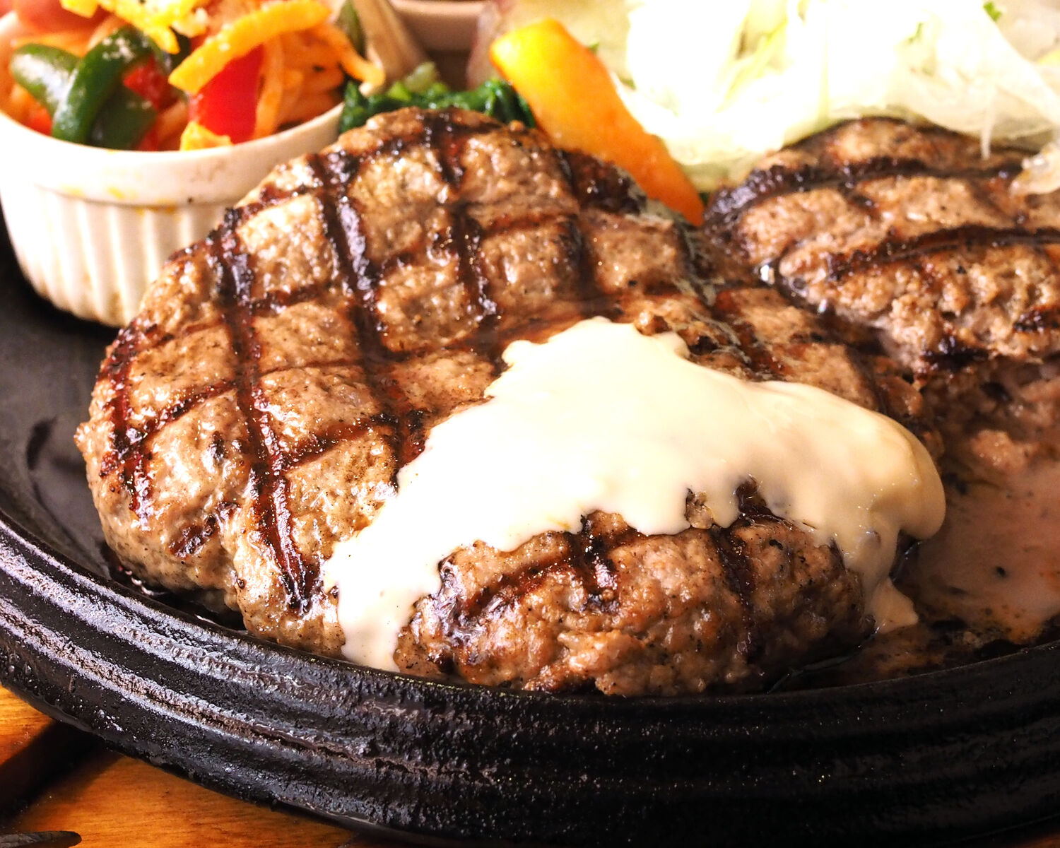 熱々な鉄板で提供されるハンバーグはチャコールグリラーで焼かれていることでの焼き目がおいしさを演出しています
