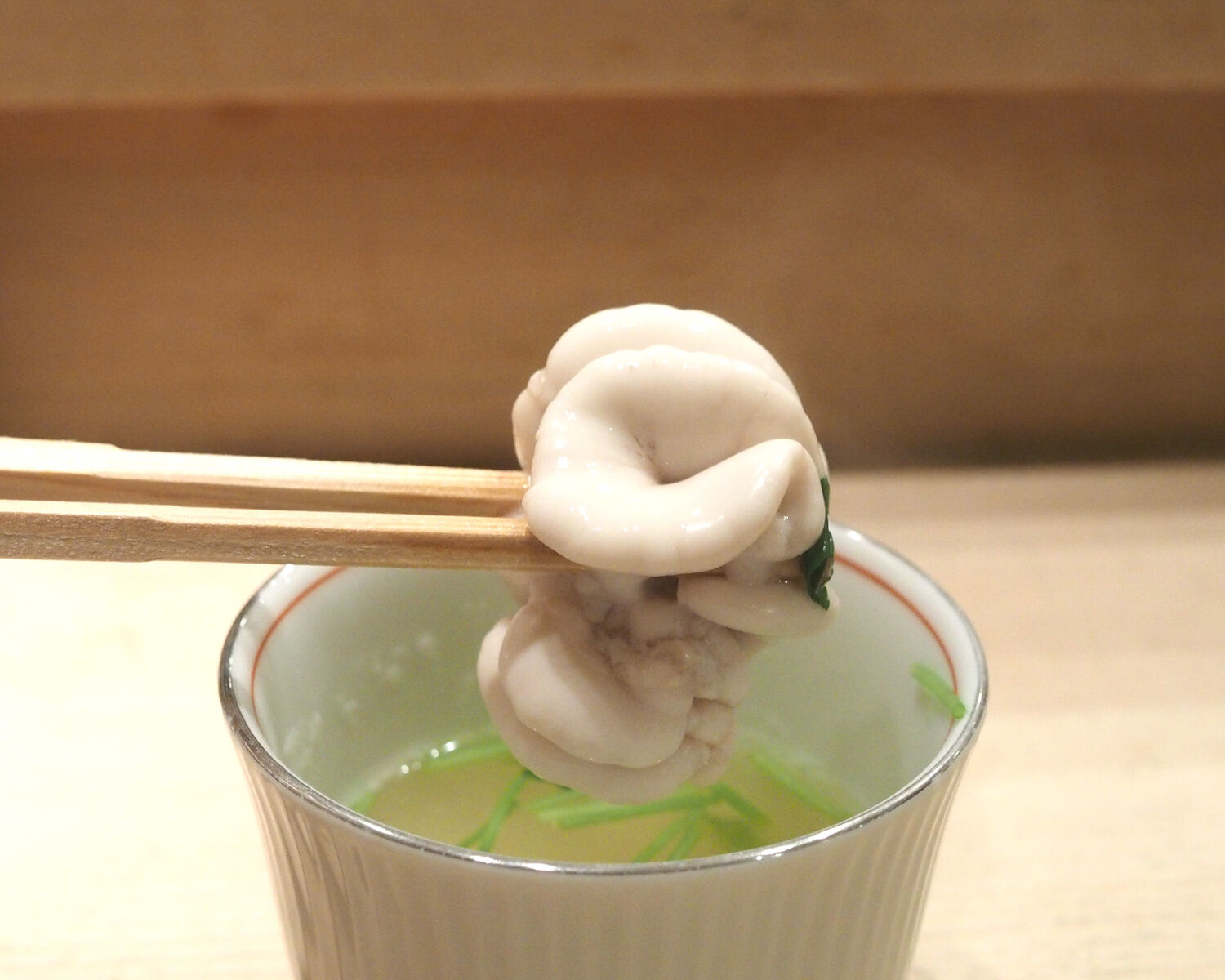 最初にいただけたのは前菜として提供していただいた"白子のすまし汁"でありまして、その白子の大きさにビックリするだけでなく、とろけるような舌ざわりと濃厚なミルクのような味わいに感動であります