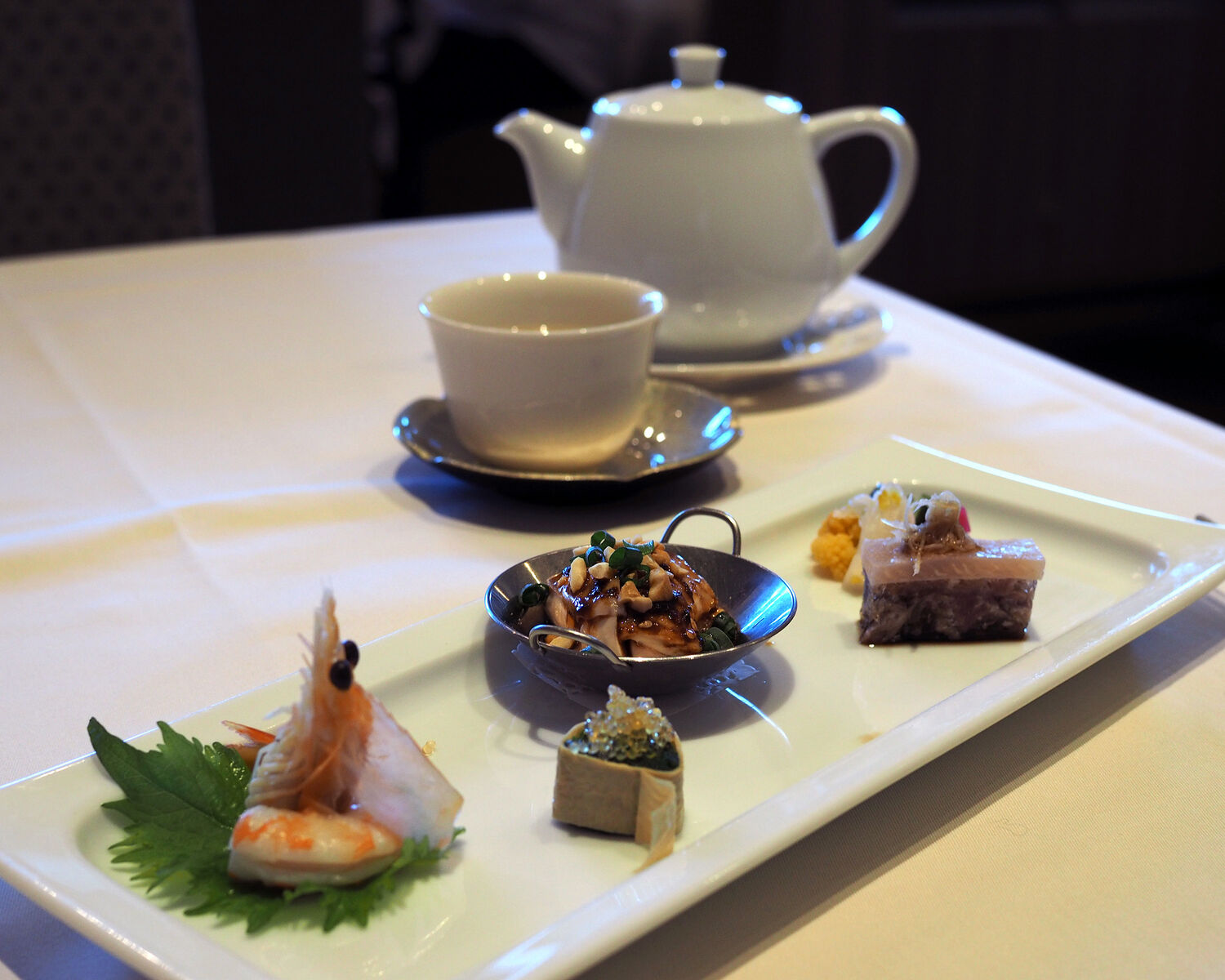 ほのかに感じるキンモクセイに似た香りと茶葉の甘みを味わいながら選んだのは、3品用意されたメイン料理から2品を選ぶことができる「礼華御膳」であります