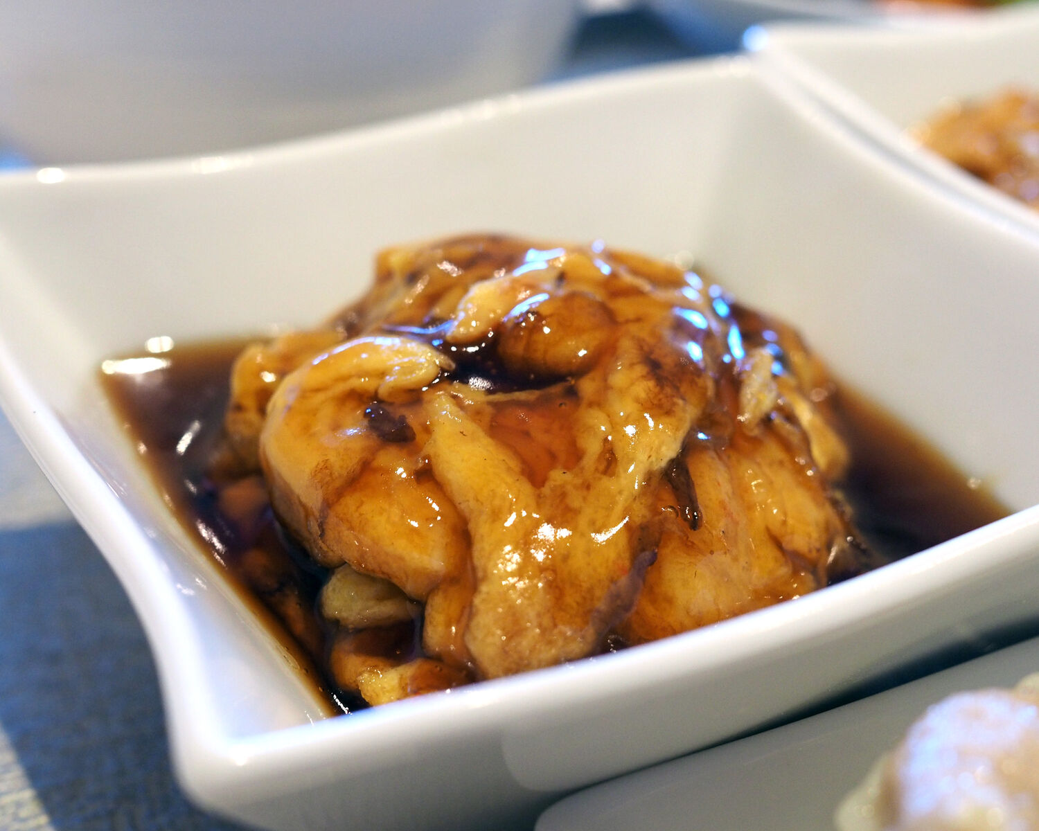 最初に提供していただいた前菜は5種の盛り合わせでありまして、野ばらの香りがするという紹興酒"玫瑰露酒"で煮込まれたバナメイのやさしい口当たりと小さな中華鍋のような器に盛られたよだれ鶏の刺激的な辛さなど、味わいや食感のアクセントを楽しませていただきました