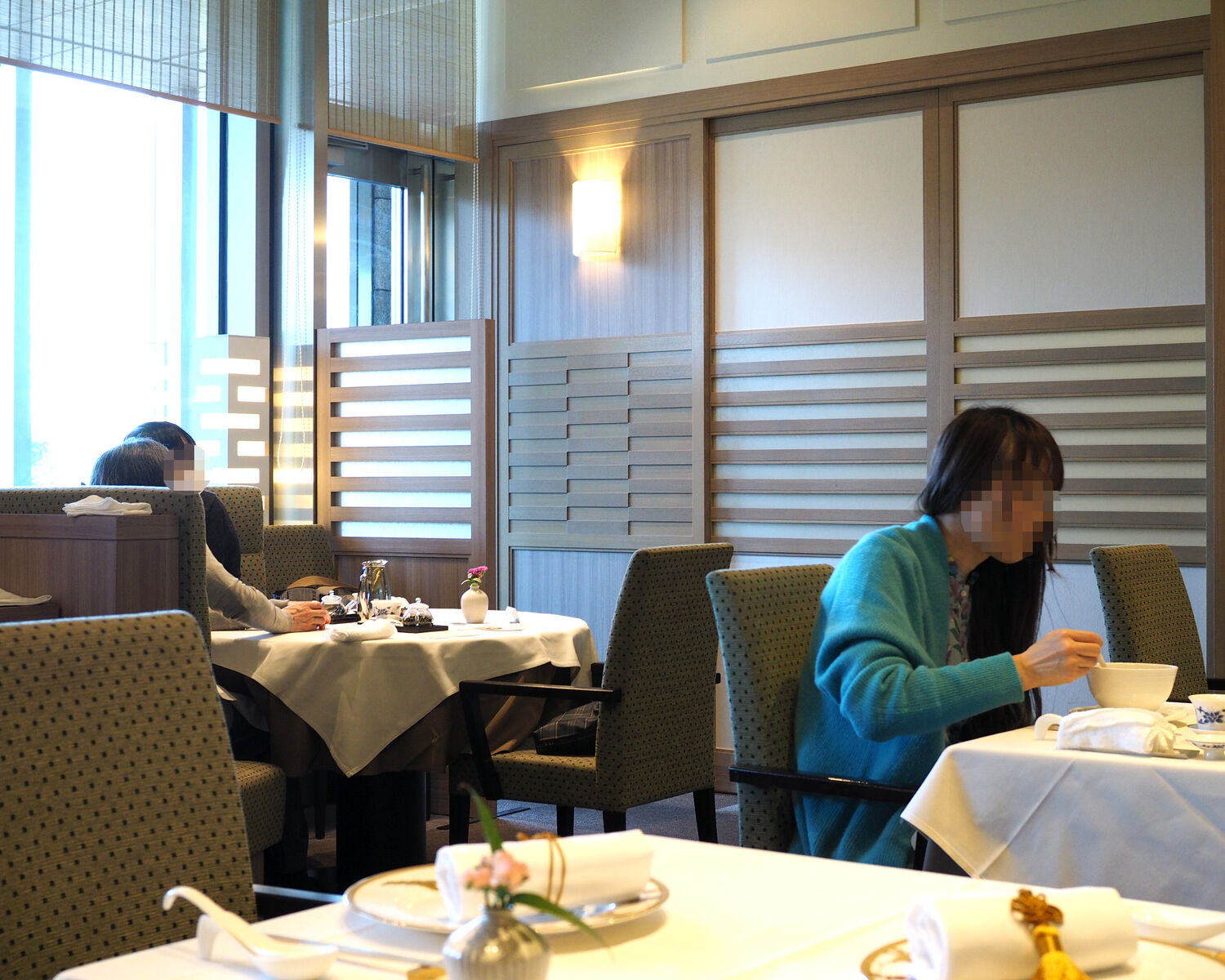 いただいたのはテラス席側にある大きな窓からの日差しに開放感を感じるテーブル席でありまして、金で縁取られたお皿にナプキンが準備されることから"ヌーベルシノワ"であることを窺い知ることができます