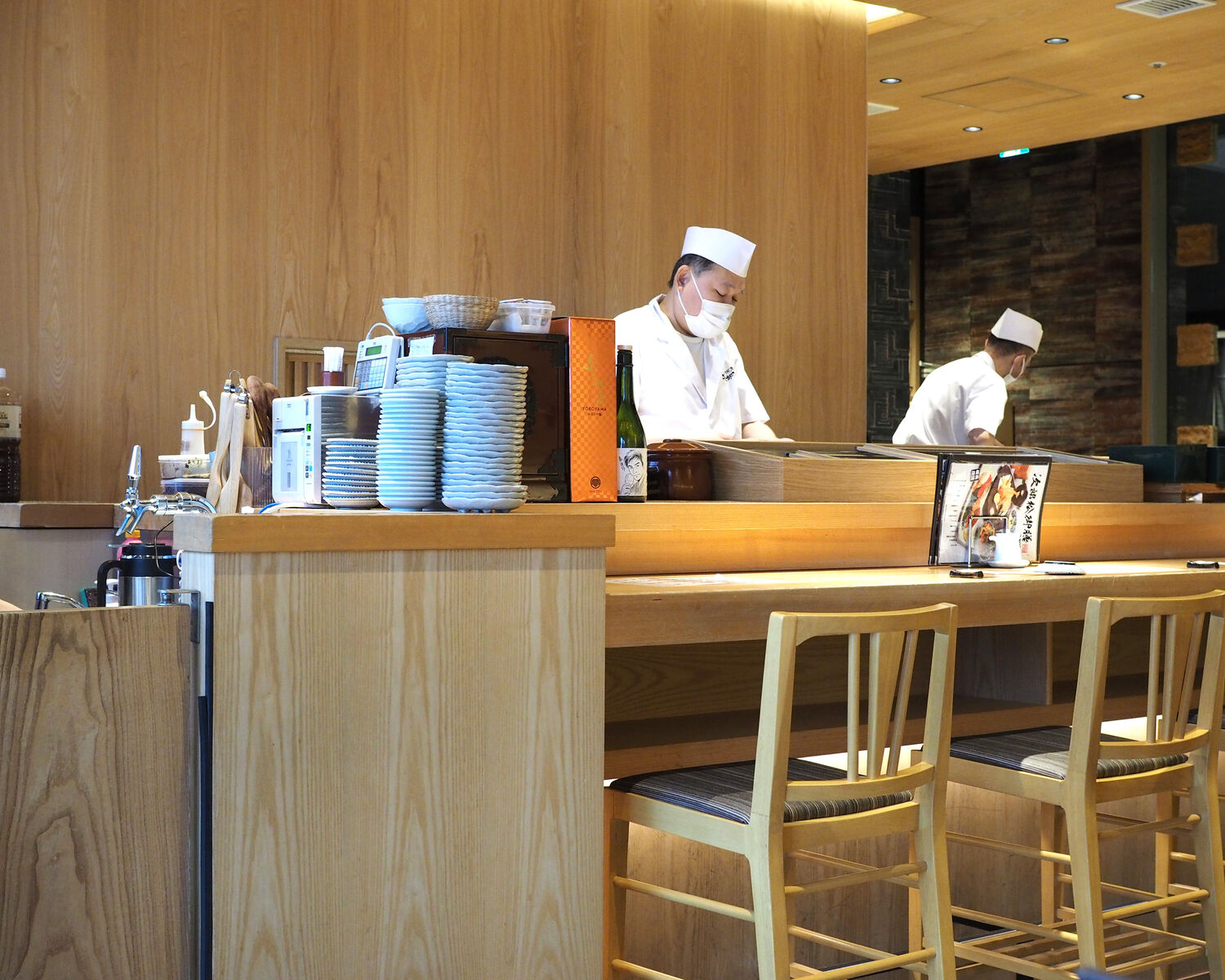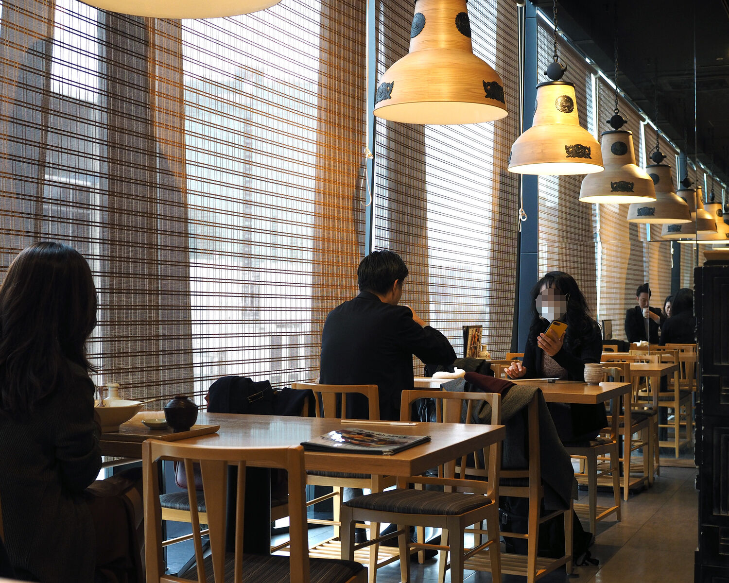 印象的な大きな暖簾を潜りますと、白木で作られたカウンター席のほか、外堀通りを眼下にする窓側にはテーブル席が置かれていまして…