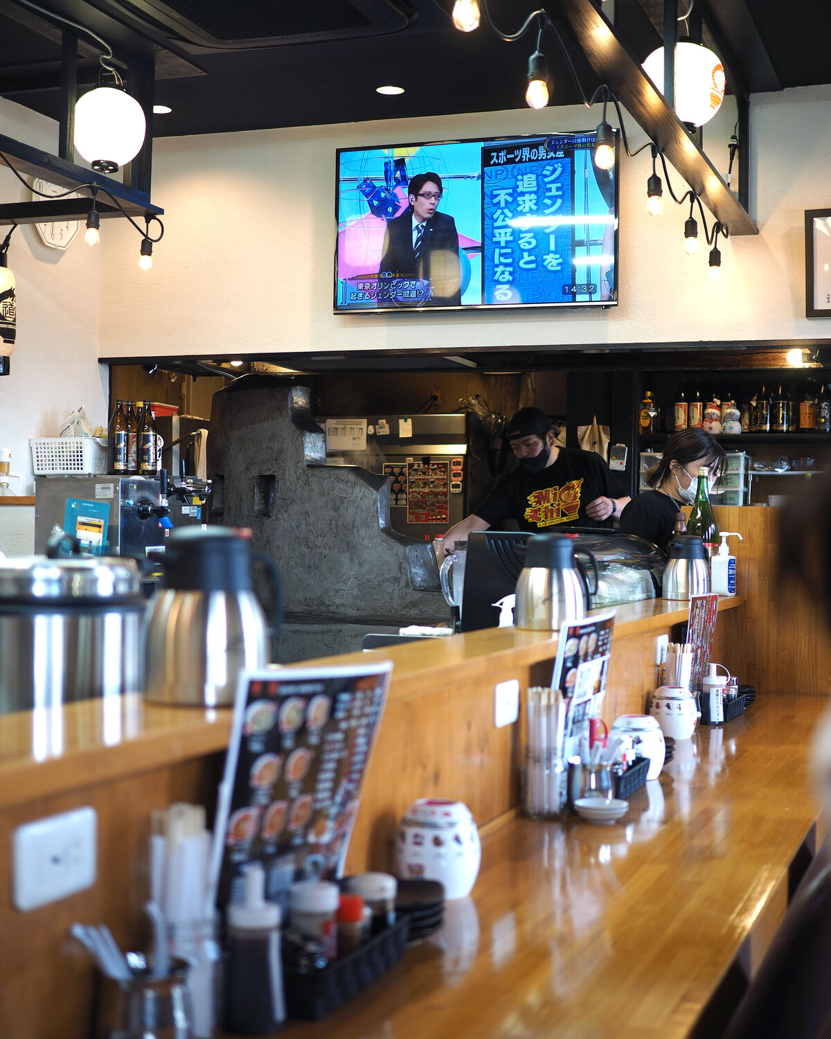店内にはコの字型のカウンターが造られていまして、その手前側には10席ほどのカウンター席が、そしてぐるりと回った奥側には3つのテーブル席がありまして…