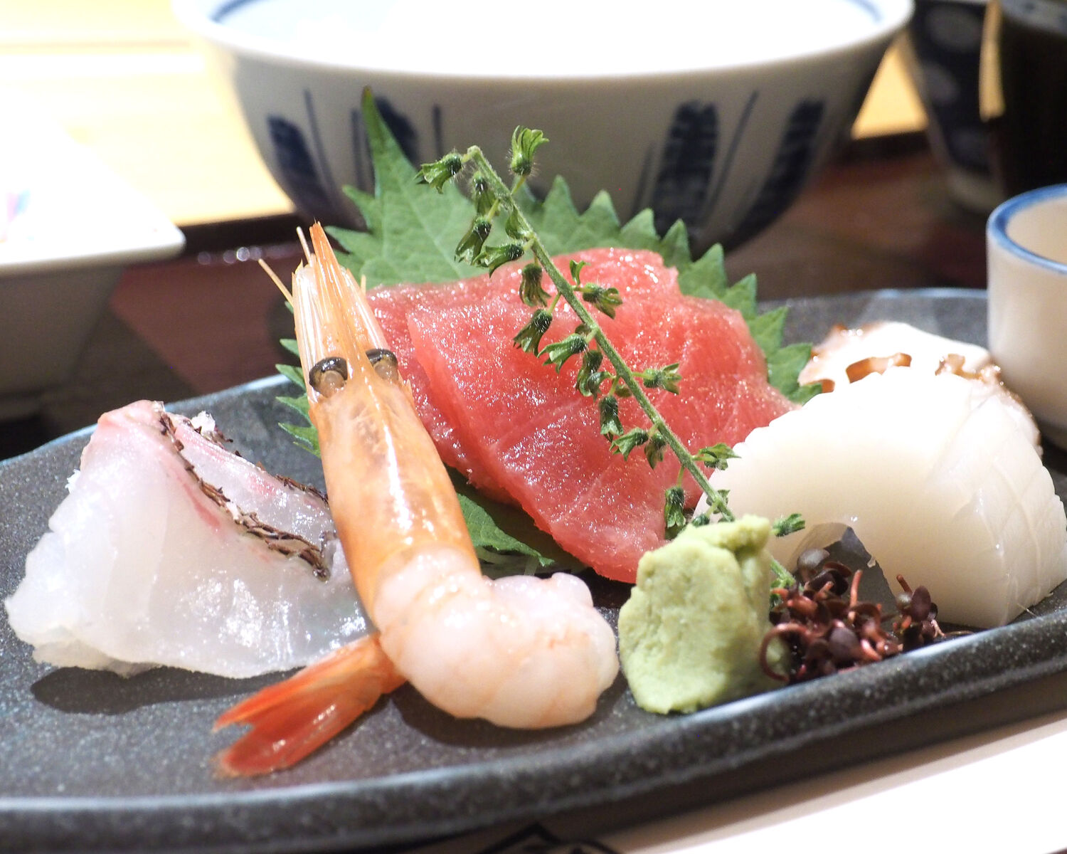 盛られるのは鯛とまぐろの赤身、それに甘海老、イカ、タコの5種でありますが…