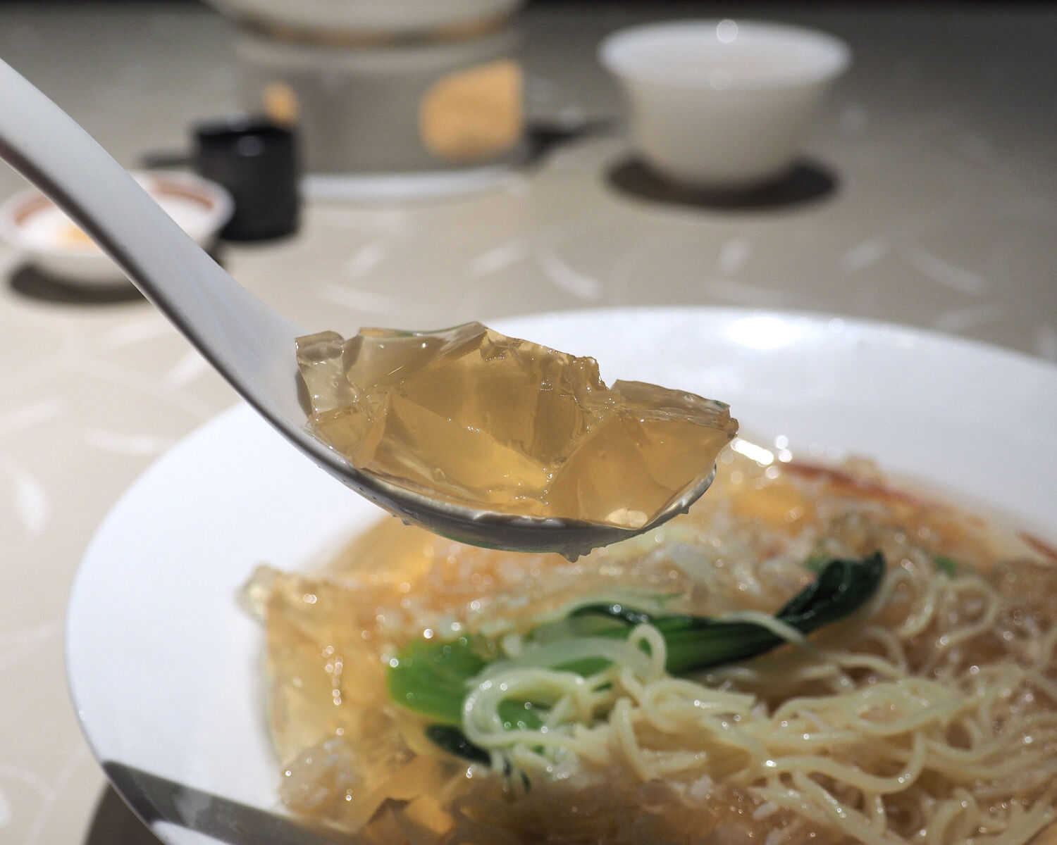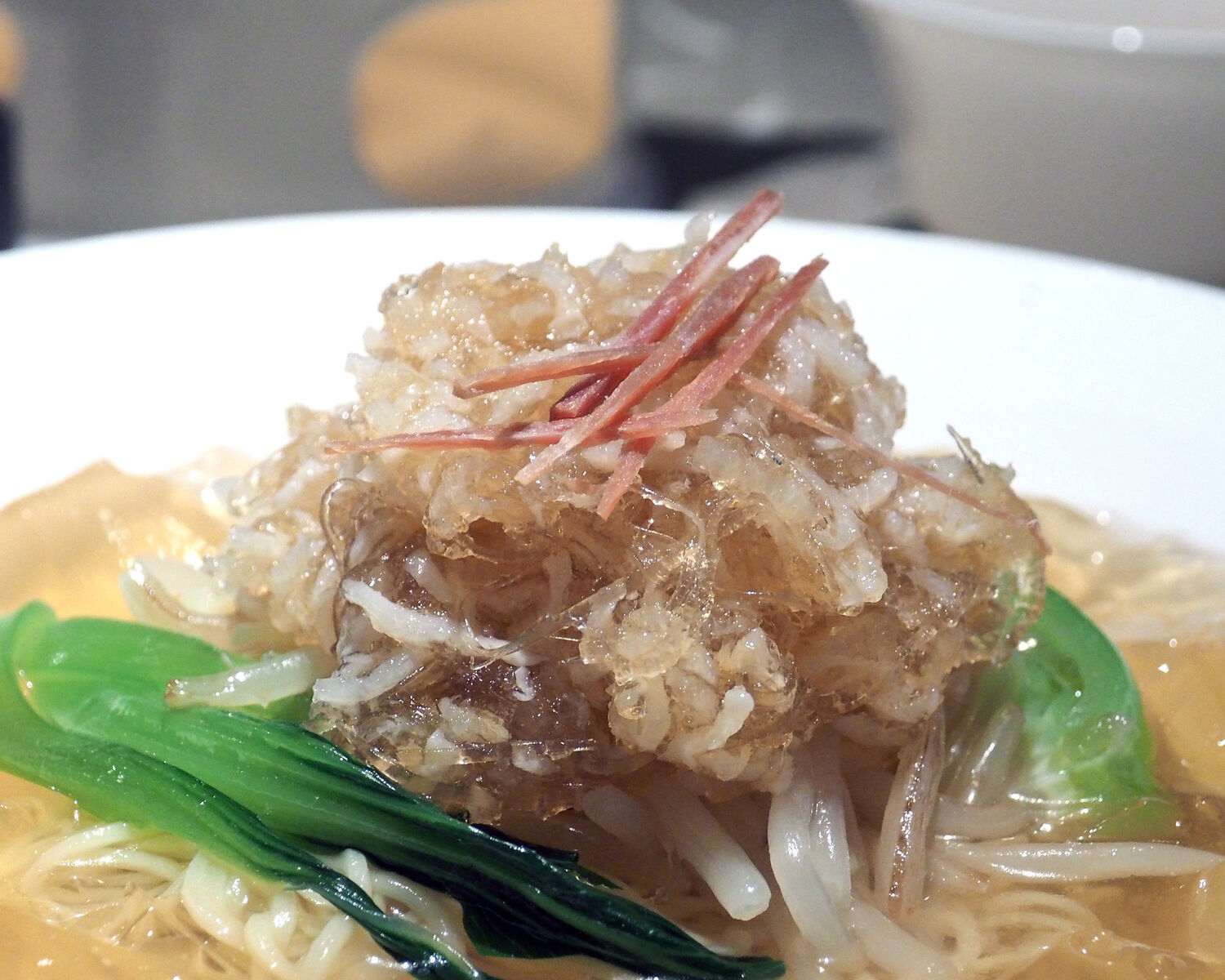 提供されたつゆそばの中央にはコラーゲンでまとめられているであろうふかひれの玉が鎮座していまして…