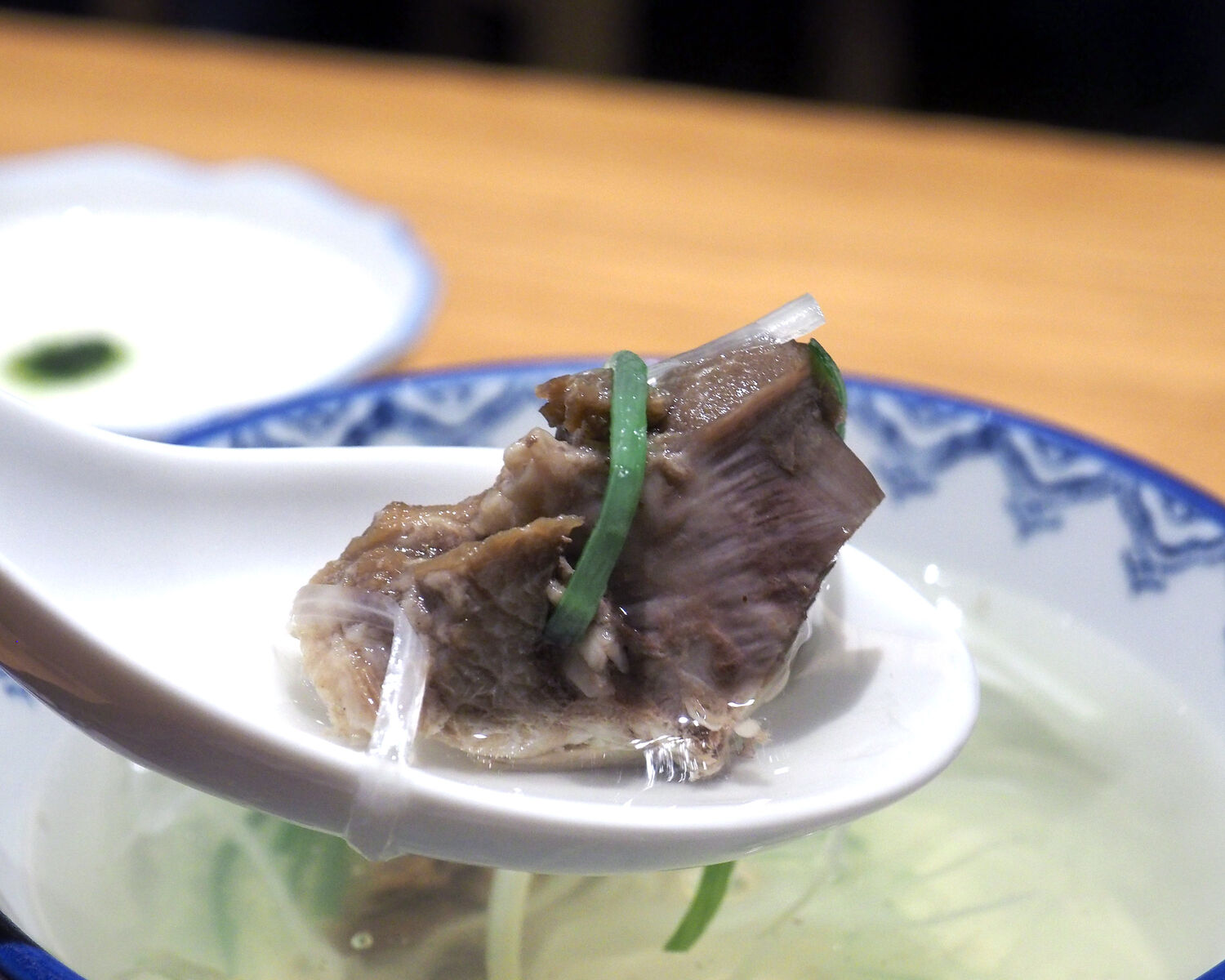 20mm角ほどのテールがゴロンとふたつ入った贅沢感だけでなく、旨みがたっぷりな澄んだスープは白髪葱が添えられていることであっさりといただけるのであります
