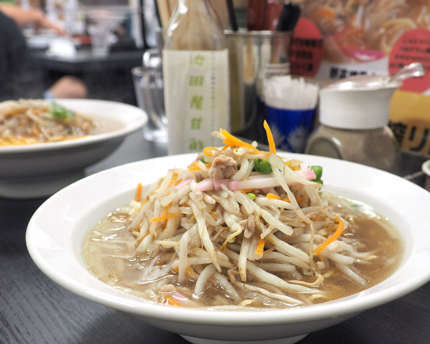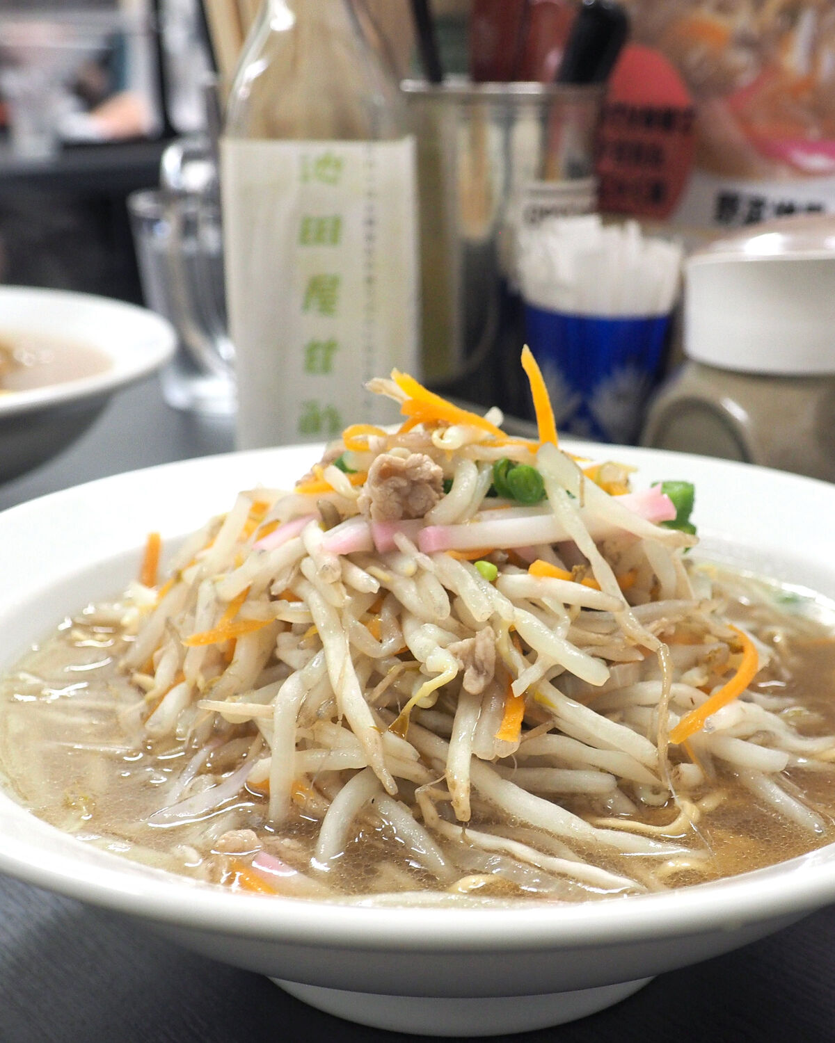 炒め野菜の塩味が少し強かったことが残念ではありましたが、シャキシャキとしたもやしの歯ざわりが心地よく、あっさりスープと絡む細めの蒸し麺もおいしくいただけました